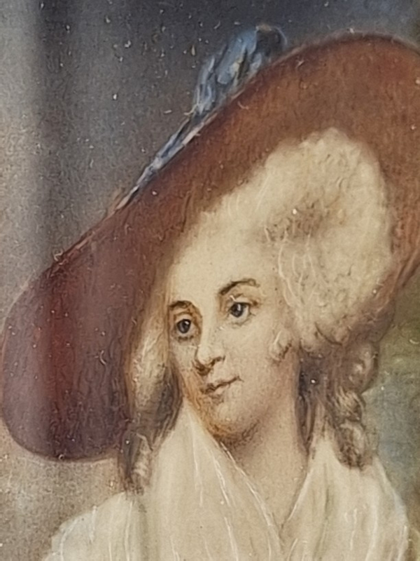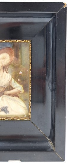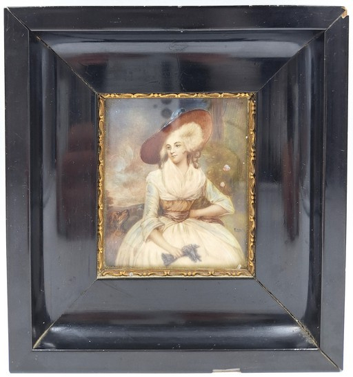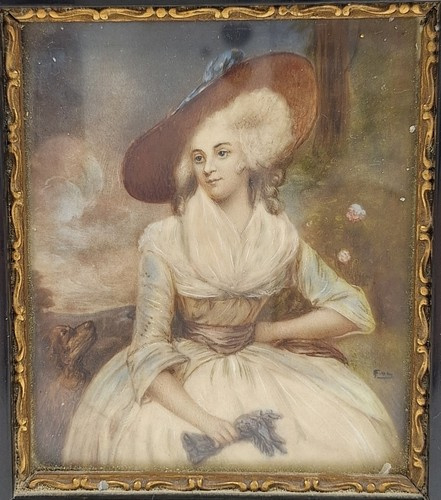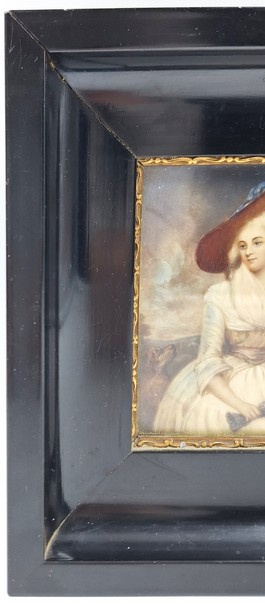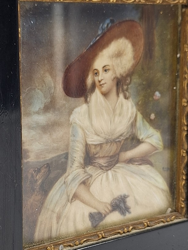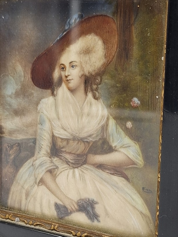Artikelnummer: S25106Miniatuurportret in houten lijstje. Naar het portret 'Mrs Robert Scott of Danesfield' van sir Joshua Reynolds (1723-1792). Het schilderijtje toont het prachtige beeld van de zittende dame Mrs Robert Scott met hoed en hond. Deze miniatuur reproductie is aan de rechterkant onduidelijk gesigneerd.