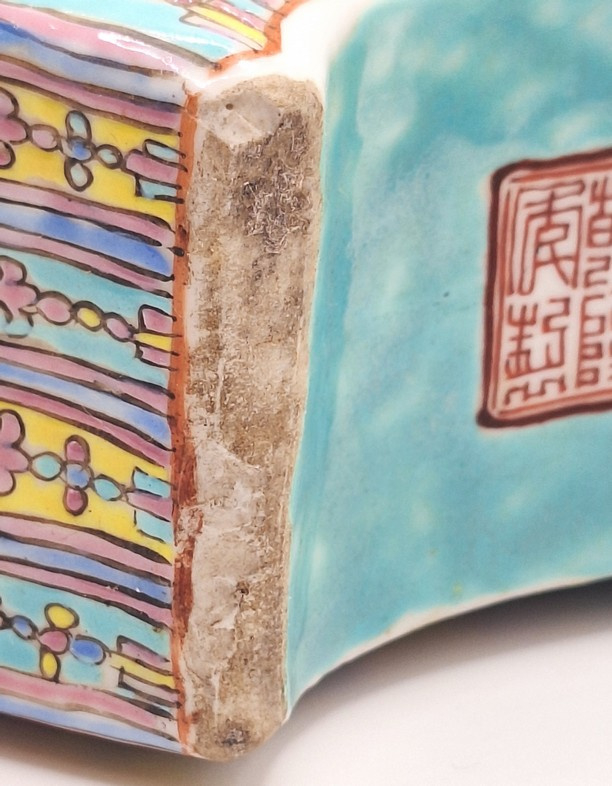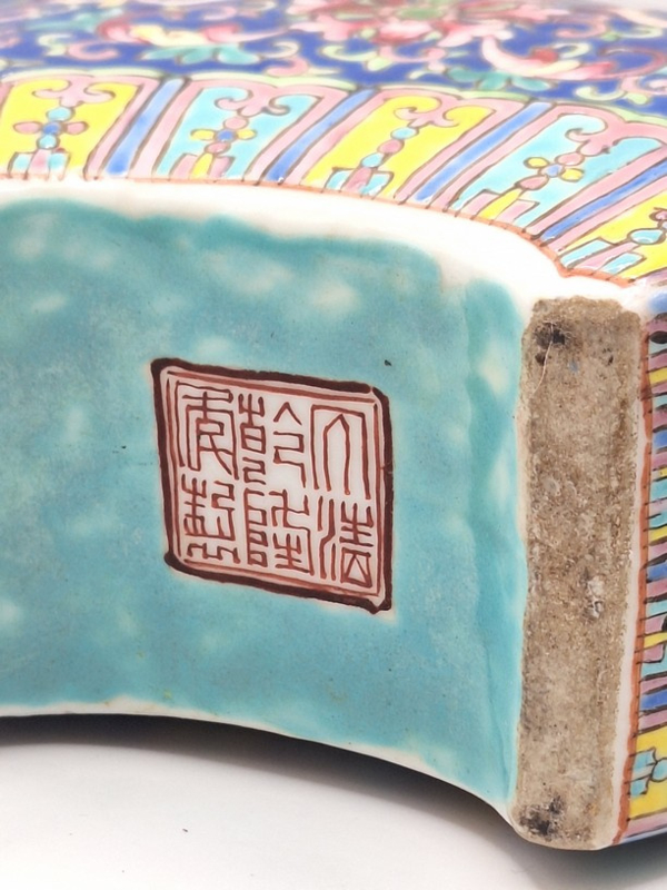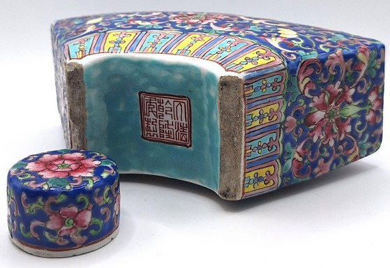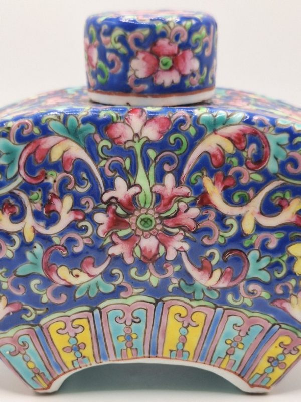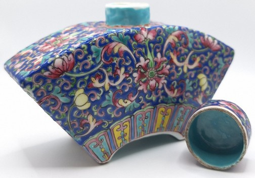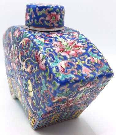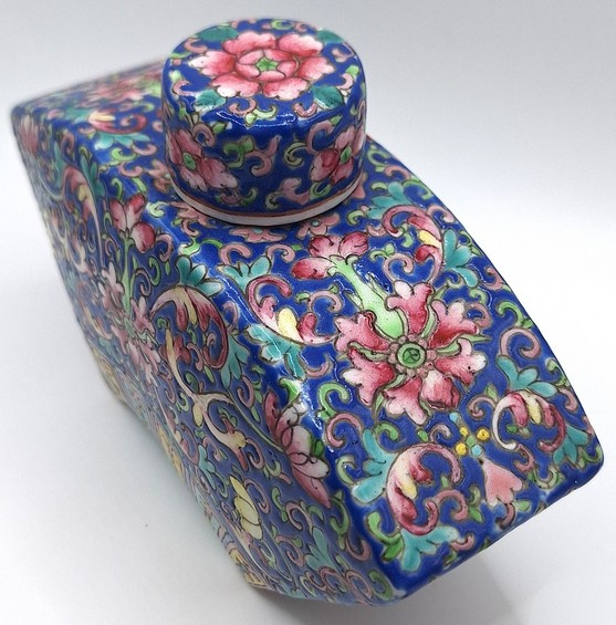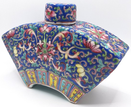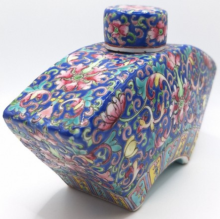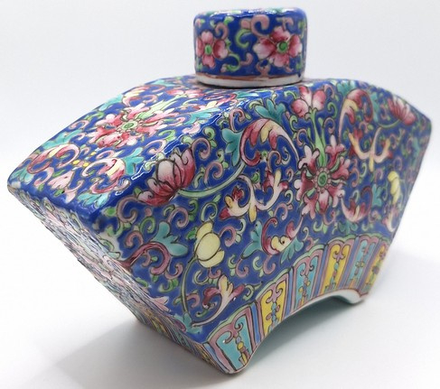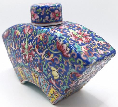 Artikelnummer: C25134Een waaiervormige theebus met dop van Chinees porselein, rijkelijk gedecoreerd met bloemen en bladeren in famille rose emaille. De theebus heeft aan de onderkant een Qianlong zegelmerk.