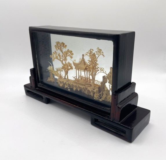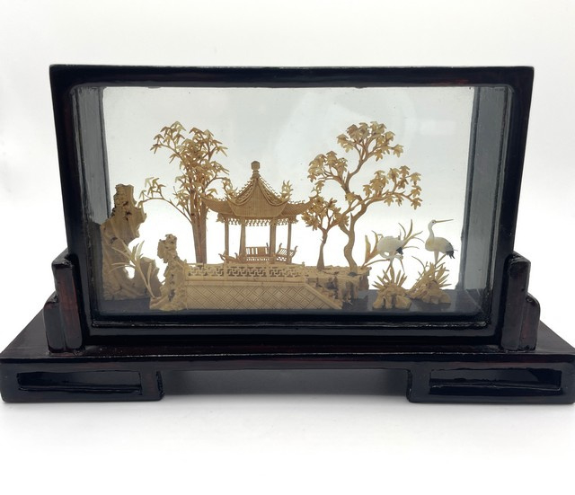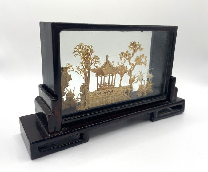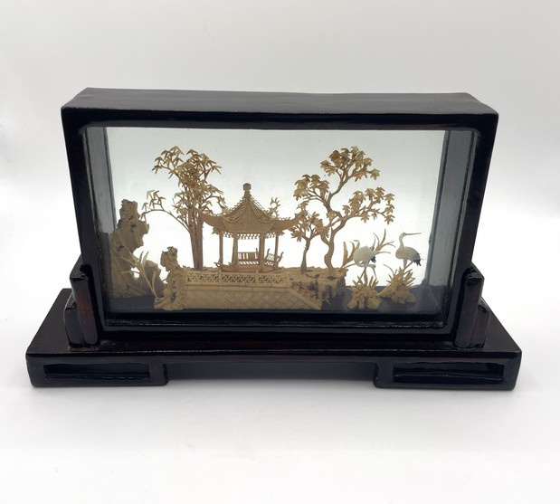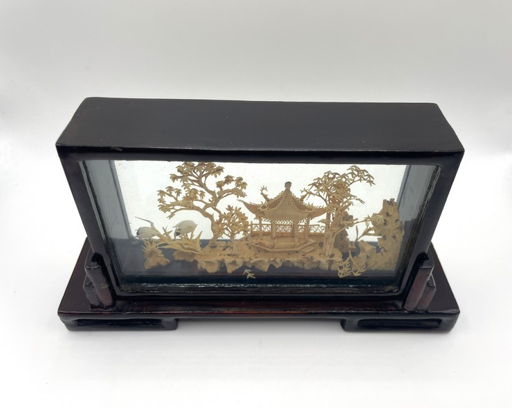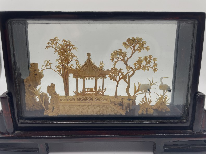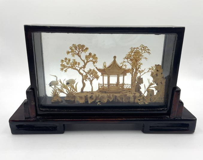 Kleine Chinese diorama met zeer verfijnd kurksnijwerk (genaamd "San You"). De voorstelling bestaat uit 2 pandaberen, bamboebomen, een pagode en 2 kraanvogels. Alles is handwerk en wordt beschermd door een houten vitrine - een waar kunstwerkje.