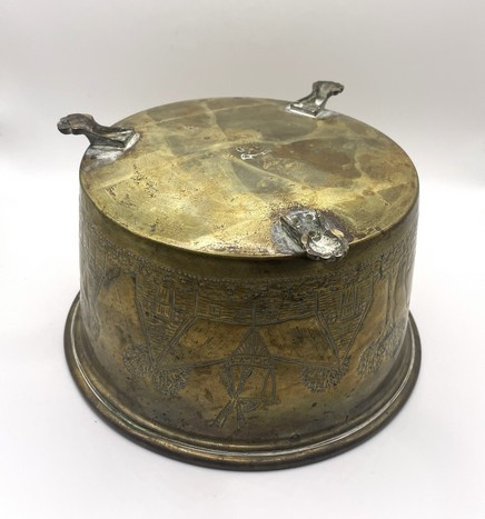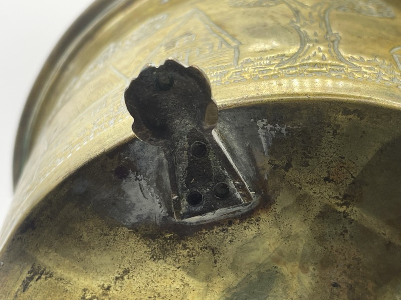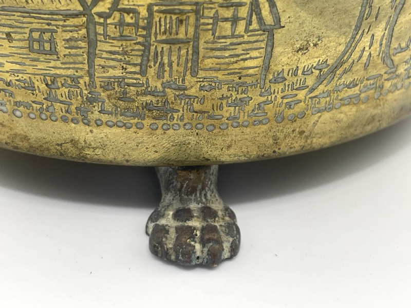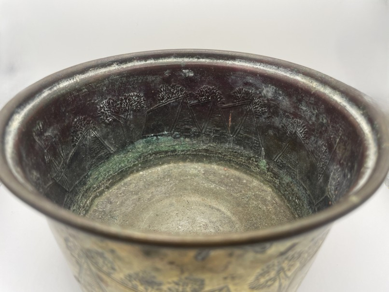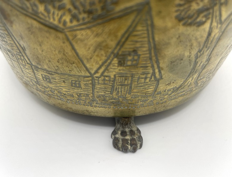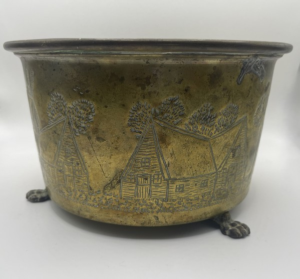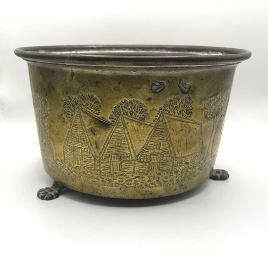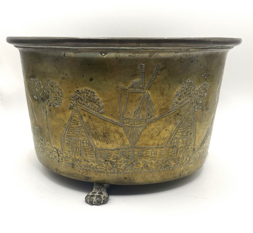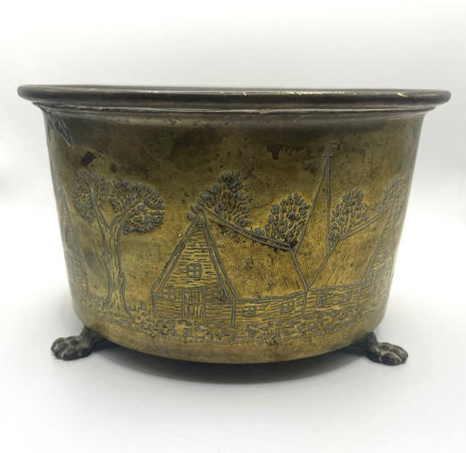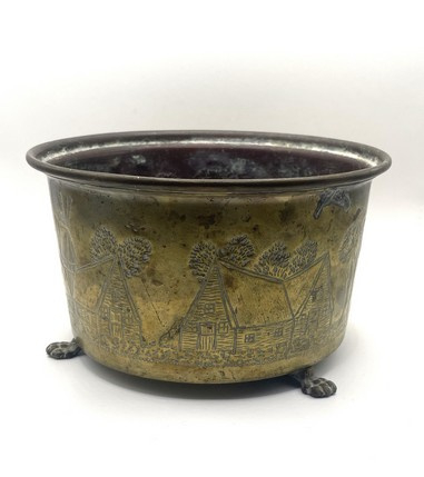 Artikelnummer: B25121Messing plantenbak / bak op klauwpootjes. De messing bak is in repoussé techniek gedecoreerd met een Hollands tafereel: boerderijen, een kerk en een windmolen. De messing bak staat op 3 pootjes, die in de vorm van leeuwenpootjes zijn gegoten.