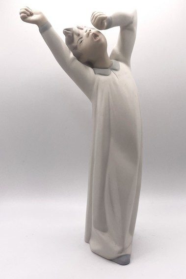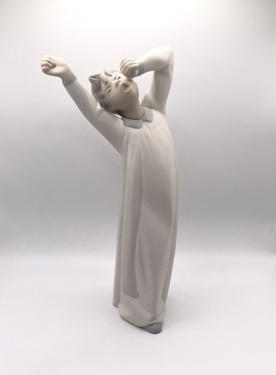 Artikelnummer: P25131Porseleinen Lladro beeldje van een jongetje die gaapt en net wakker wordt. Dit beeldje is in geglazuurde en ongeglazuurde variant gemaakt. Dit is de ongeglazuurde, matte variant.