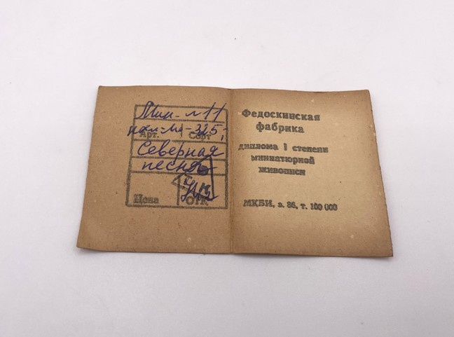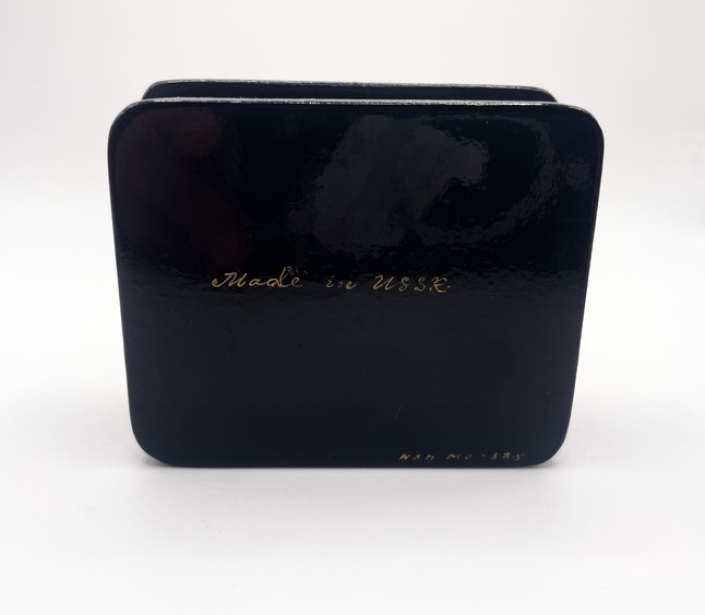 De doos is gemerkt met Cyrillische letters met de tekst "Fedoskino 1973" linksonder in de afbeelding. Rechtsonder staat ook een Cyrillische tekst, vermoedelijk de handtekening van de kunstenaar.