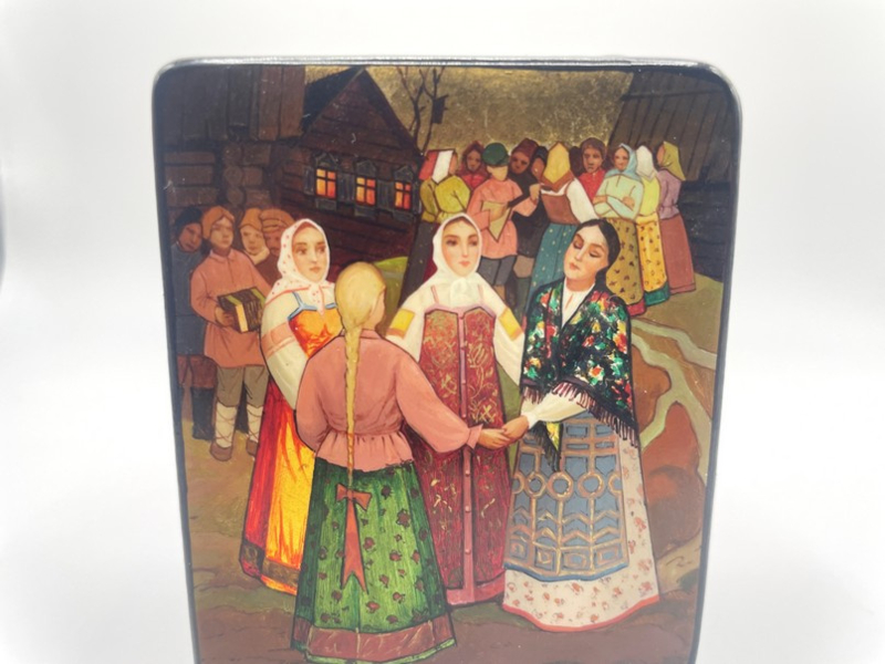 Artikelnummer: O25134Russisch zwart gelakt doosje, afkomstig uit het dorp Fedoskino. Het doosje heeft ook nog het originele certificaat van de Fedoskinskaya fabriek die eerstegraads miniatuurschilderkunst maakten. En dat is te zien - op de deksel is een voorstelling van een dorpsfeest afgebeeld, waarbij de gezichtjes van de 4 vrouwen op de voorgrond fenomenaal zijn vormgegeven. Ook de details op de kleding is met goudkleurige verf geaccentueerd. De binnenkant is rood gelakt.