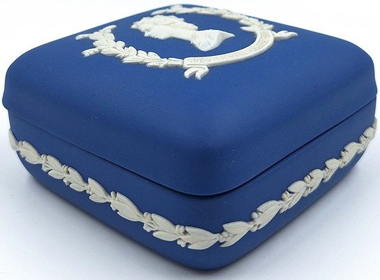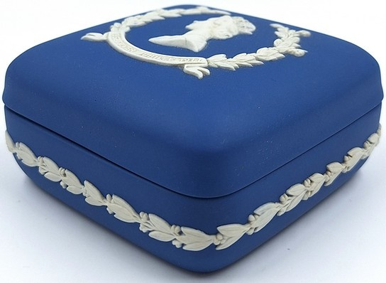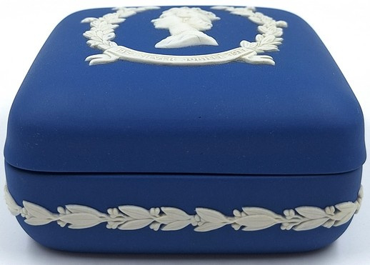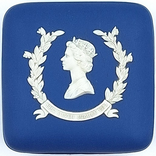 Artikelnummer: A25222Prachtig vierkant dekselbakje, ter ere van het zilveren jubileum van Koningin Elizabeth II in 1977. Het doosje heeft een mooie donkerblauwe Jasperware kleur met herkenbare witte reliëfdecor. Aan de bovenkant van de deksel zien we een profiel van Elizabeth, omringd door een lauwerkrans en banner met de tekst '1952 Silver Jubilee 1977'.