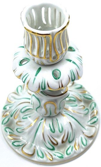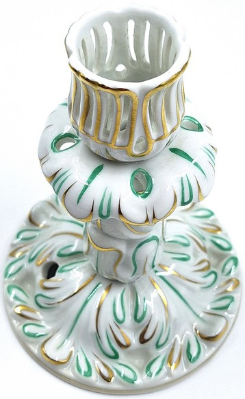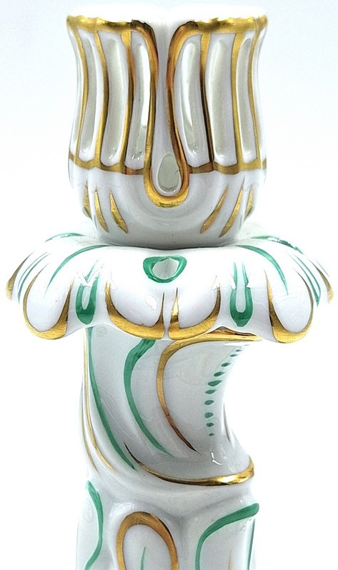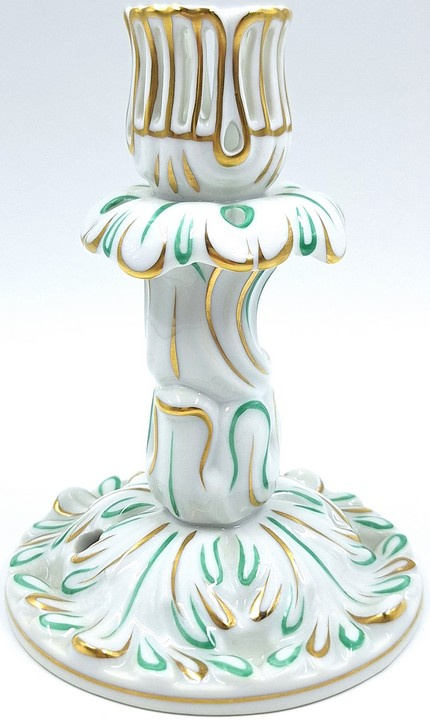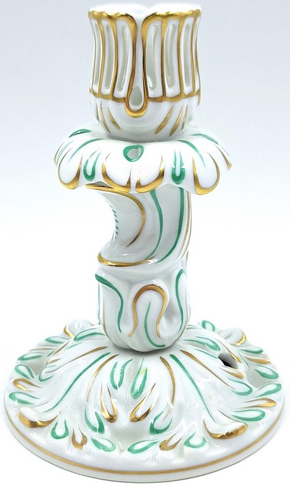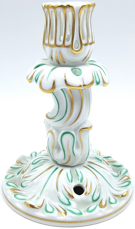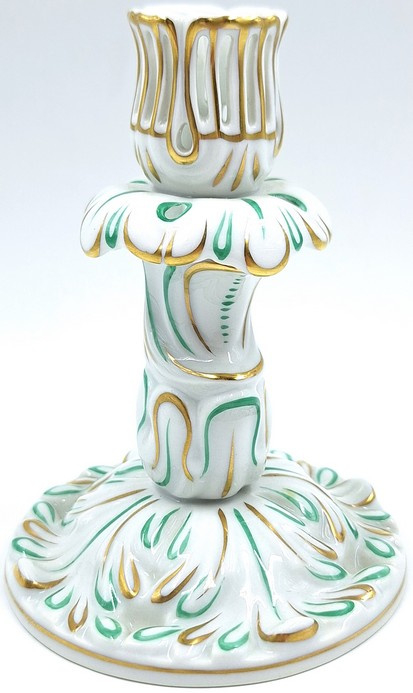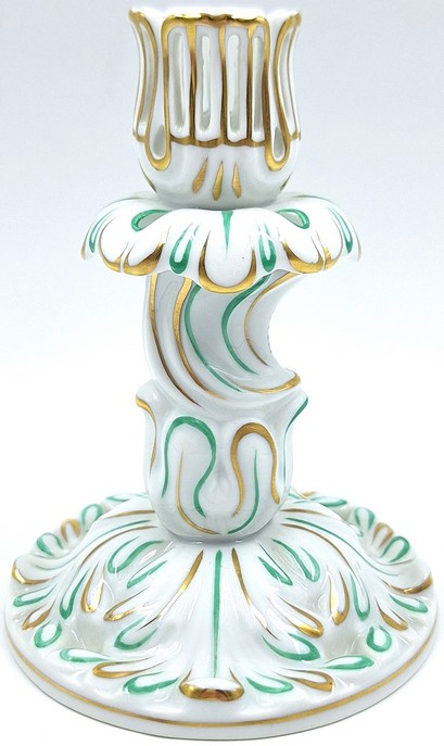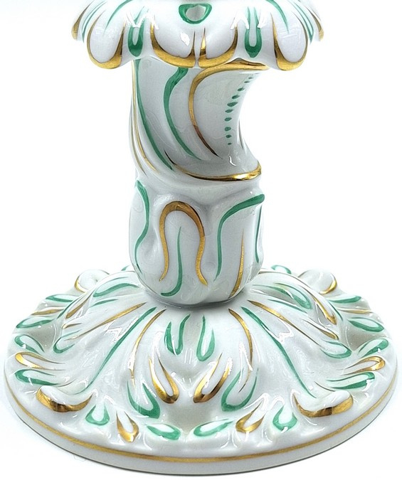 Herend Hungary kandelaar met Apponyi groen decor. Herend is wereldberoemd vanwege zijn kostbare en fraai bewerkte voorwerpen van porselein. Ieder stuk wordt met de hand beschilderd door porseleinschilders die de fabriek zelf opleidt.