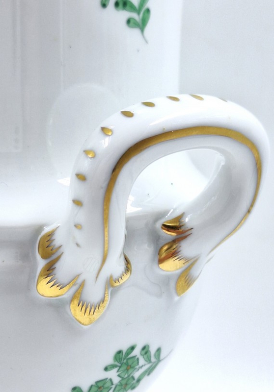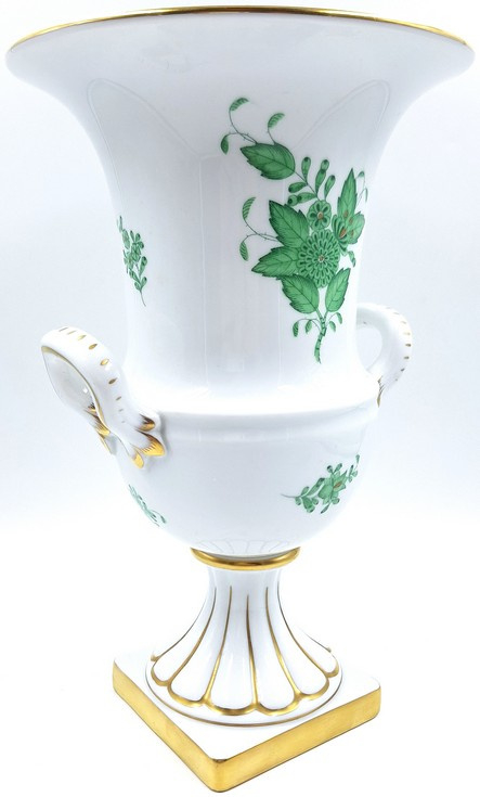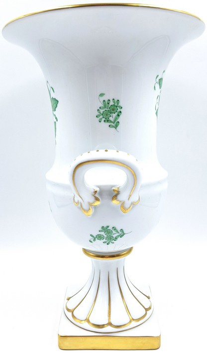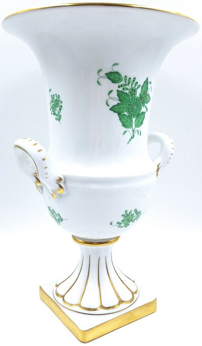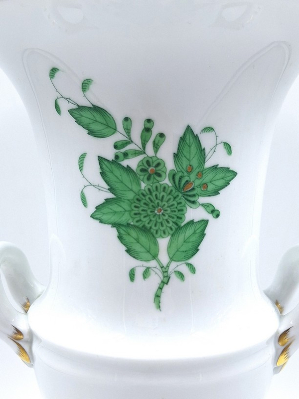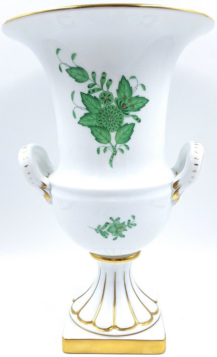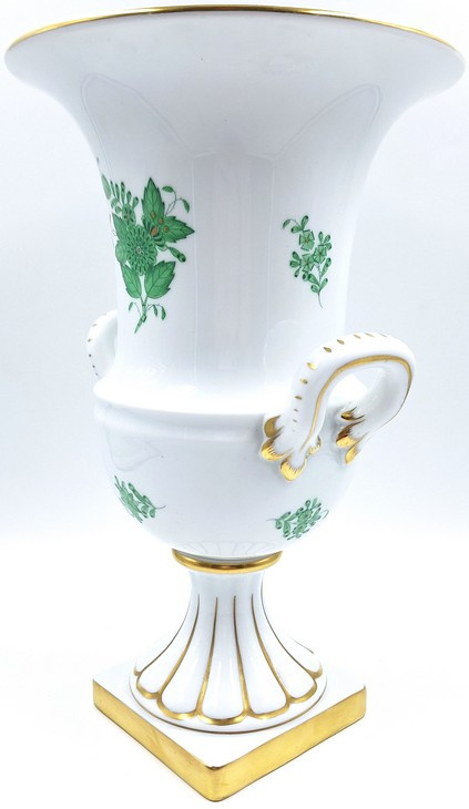 Artikelnummer: A25224Prachtige empire stijl vaas, gemaakt door Herend. Dit klassieke Apponyi patroon staat beter bekend onder de naam 'Chinese Bouquet'. De wit geglazuurde ondergrond vormt het canvas voor de prachtige groene en gouden decoratie die rondom is aangebracht. De vorm van de vaas is een urn op een vierkante voet.