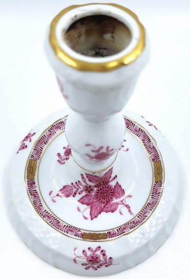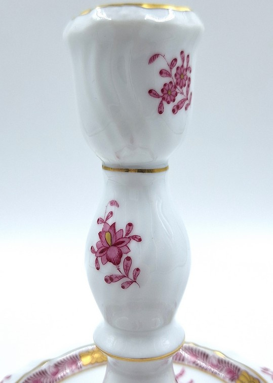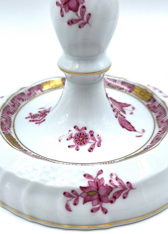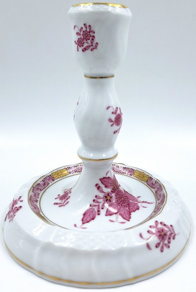 Herend Hungary kandelaar met roze en gouden decoratie: het Chinese Bouquet Raspberry decor. Herend is wereldberoemd vanwege zijn kostbare en fraai bewerkte voorwerpen van porselein. Ieder stuk wordt met de hand beschilderd door porseleinschilders die de fabriek zelf opleidt.