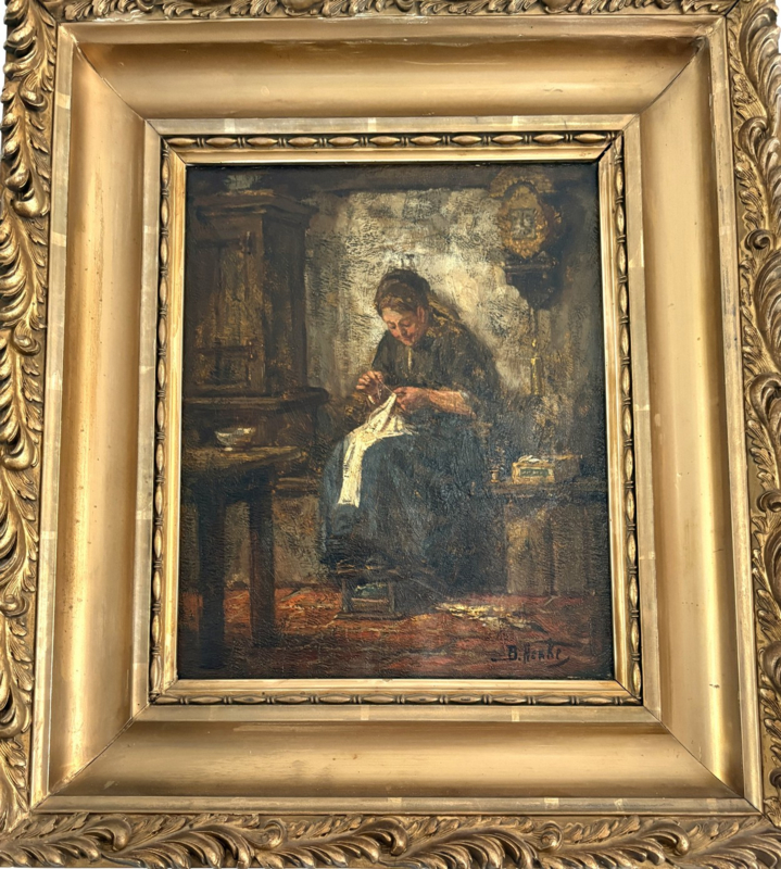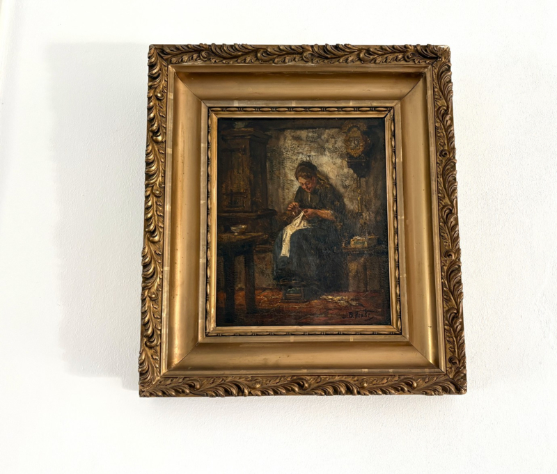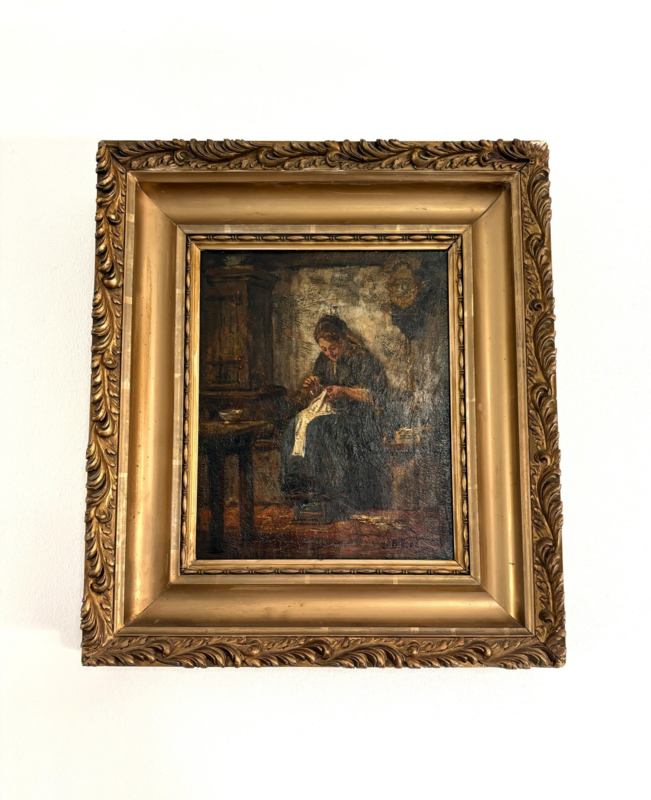 Artikelnummer: S26103Prachtig olieverf op doek met een voorstelling van een traditioneel Hollands tafereel: een dienstmeid die kleding aan het maken of repareren is. De handwerkende vrouw is omgeven door een boerderij interieur, in de stijl van de Hollandse School. Het gaat om een olieverf op doek, in een goudkleurige lijst.