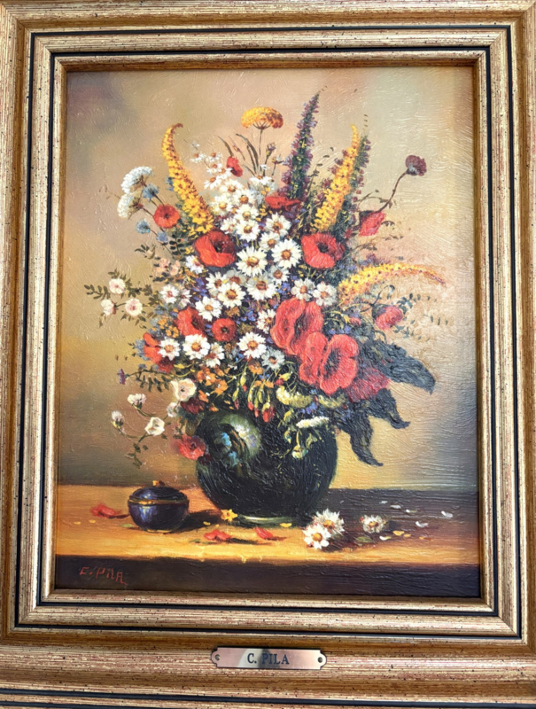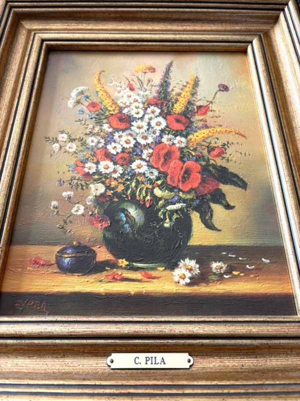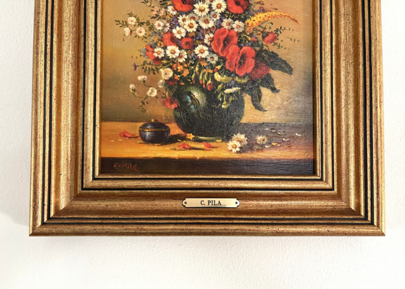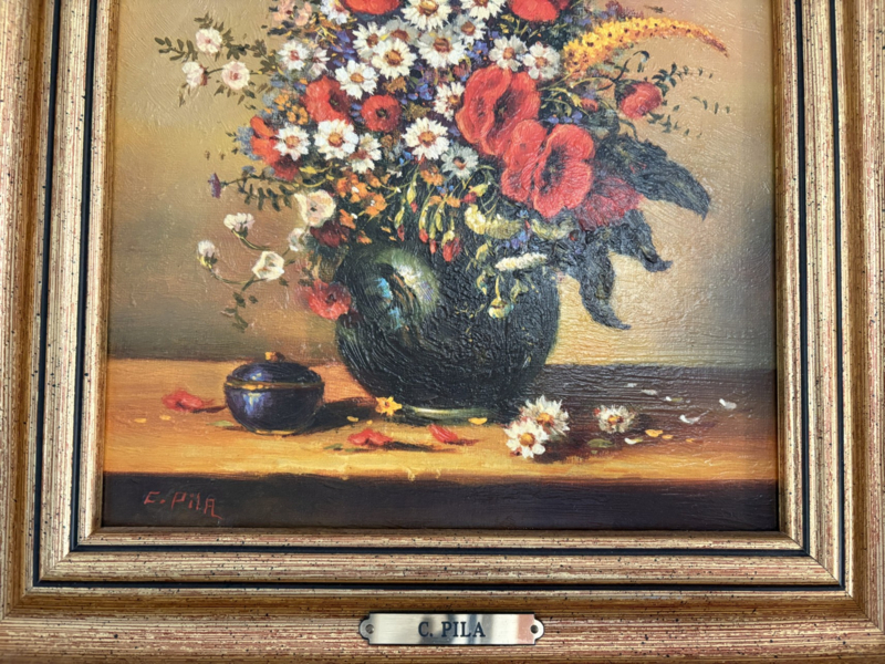 - Bijzonderheden: het schilderij is linksonder gesigneerd. De lijst heeft ook een naamplaatje met 'C. Pila'.