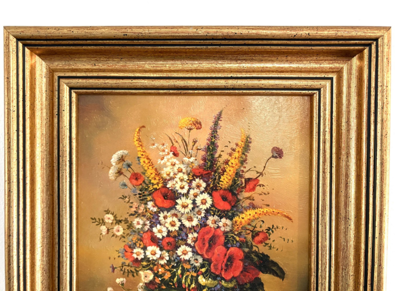 Artikelnummer: S26102Vrolijk en kleurrijk schilderij van een stilleven met bloemen. Op de voorgrond is een blauw dekselbakje zichtbaar. Het geheel is prachtig gedetailleerd weergegeven. Het gaat om een olieverf op doek, in een goudkleurige lijst.