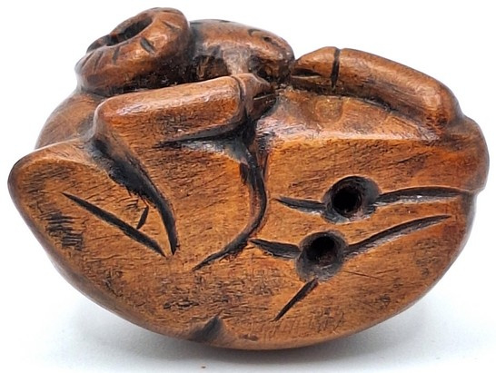 • Bijzonderheden: de netsuke wordt traditioneel gedragen bij een kimono; ondanks dat een kimono geen zakken heeft, kon er met behulp van een netsuke (gordelknoop) toch attributen meegenomen worden aan de riem van de kimono.