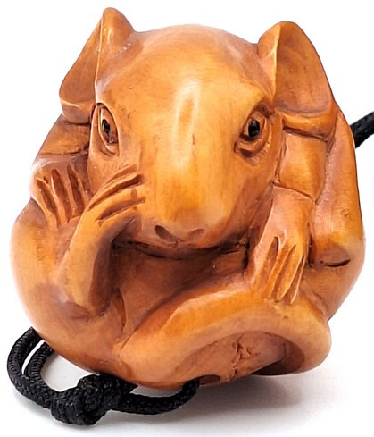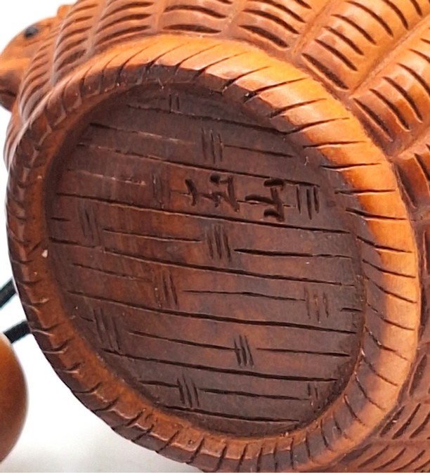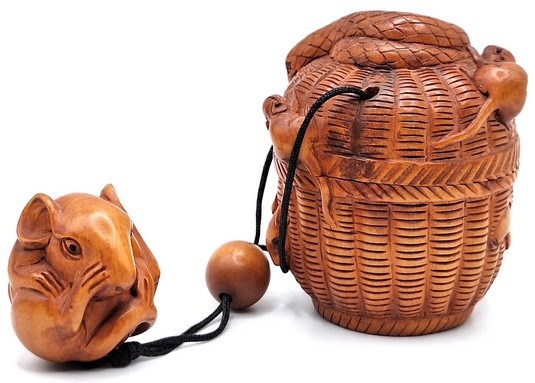 Een klein meesterwerkje - deze Japanse inro met één compartiment. Het is een prachtig gedetailleerd mandje met reliëfdecor, met bovenop een slang. Over het mandje heen zijn speels een aantal ratjes zichtbaar. Aan het uiteinde van het touwtje van de inro is een netsuke van een ratje aanwezig om het geheel af te maken. Alle oogjes zijn ingelegd met onyx. De inro is gesigneerd aan de onderzijde.