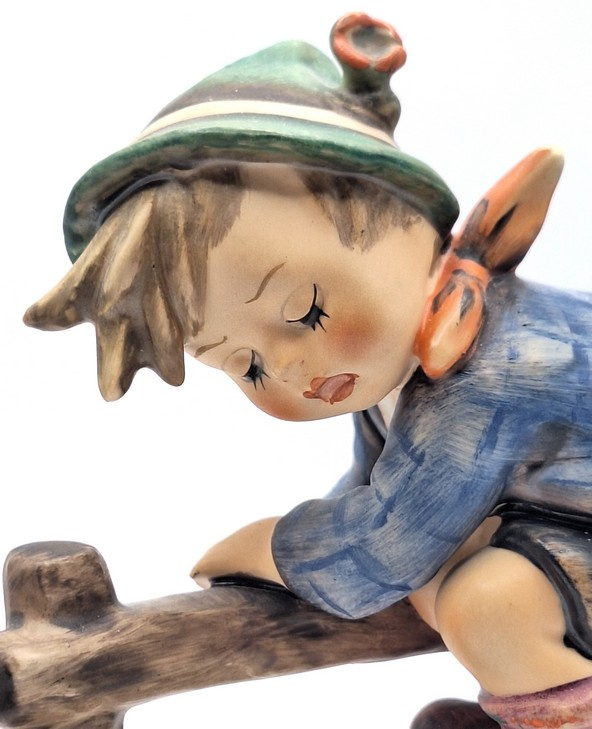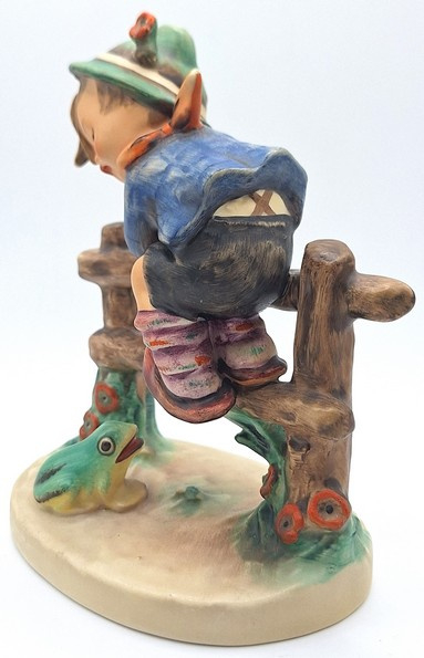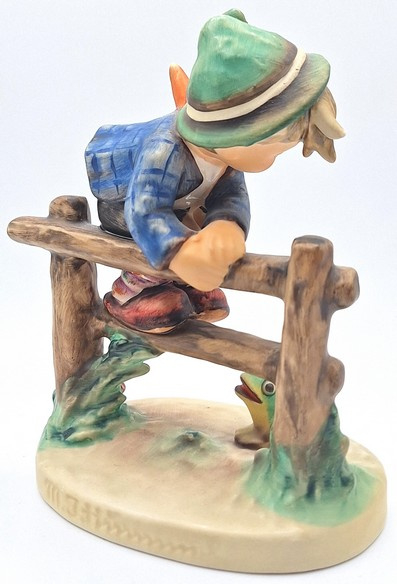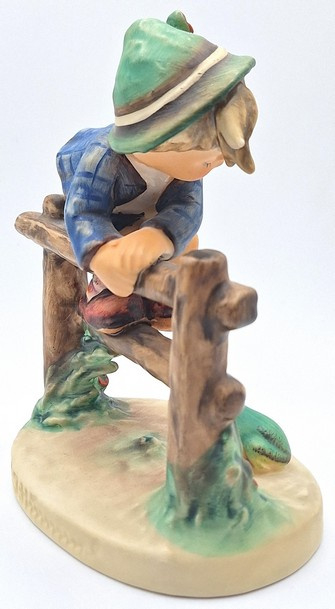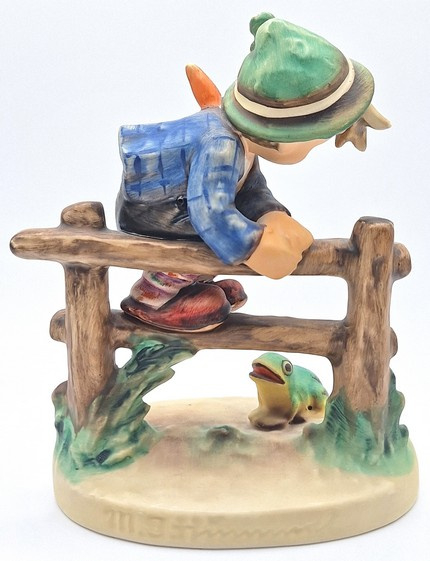 Artikelnummer: A26108Dit charmante Hummel-beeldje toont een jongetje bovenop een hek, waar hij zich in veiligheid heeft gebracht om te ontsnappen aan de kleine kikker beneden. Het beeld draagt de naam 'Retreat to safety' met nummer 201/1.