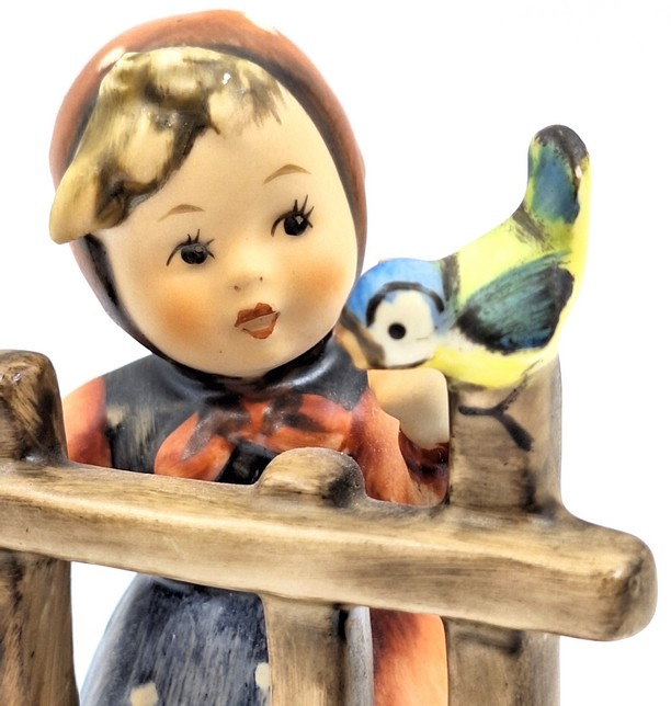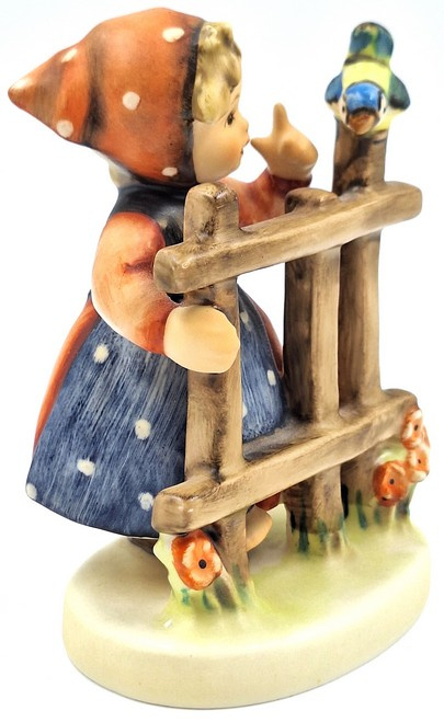 Artikelnummer: A26121Prachtig Hummel beeld van een meisje met vogel op een hek. Dit Hummeltje heeft nummer 203 en wordt ook wel 'Signs of Spring' genoemd.