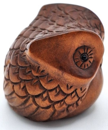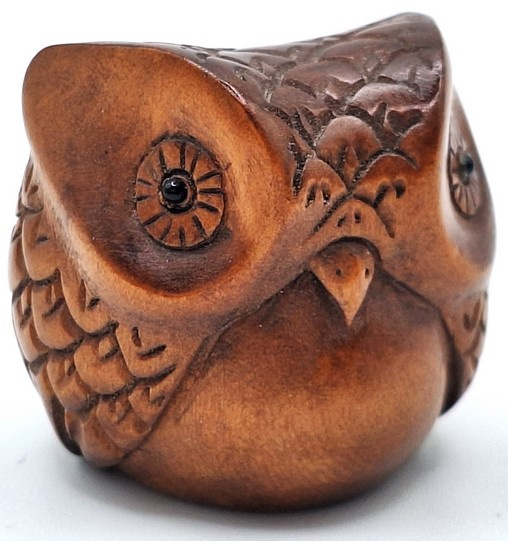 Zeer gedetailleerd uit hout gesneden uil. De ogen van het uiltje zijn ingelegd met onyx.
