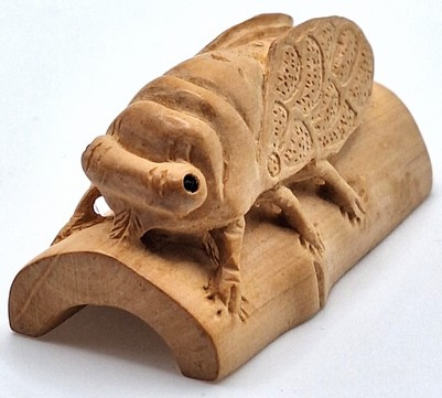 Zeer gedetailleerde netsuke van een krekel. De oogjes van de Netsuke zijn ingelegd met onyx en is gesigneerd aan de onderzijde.