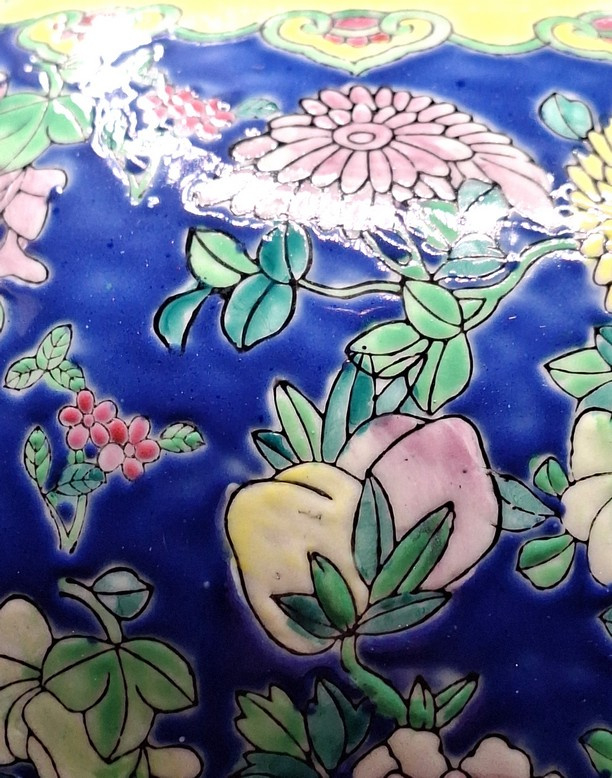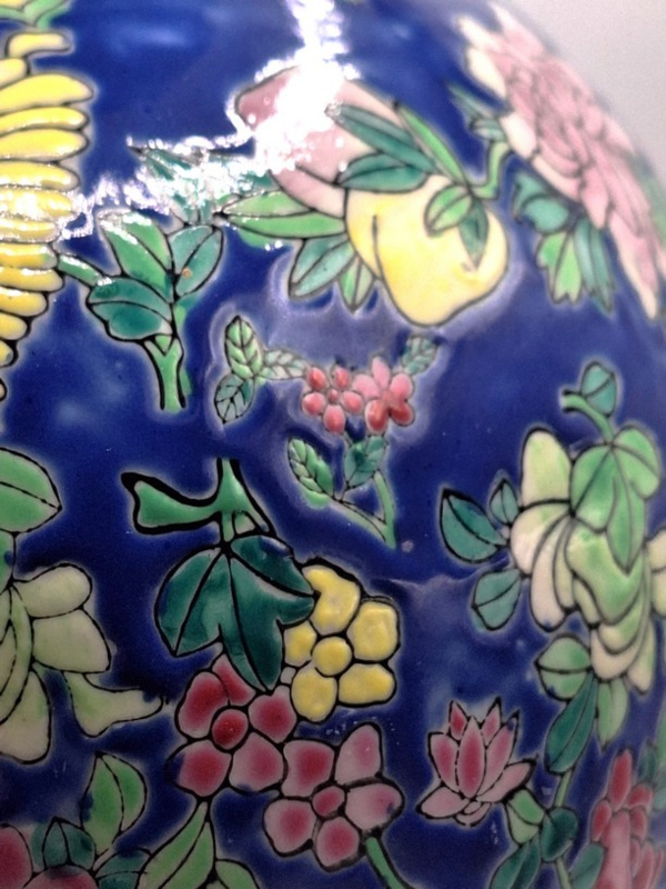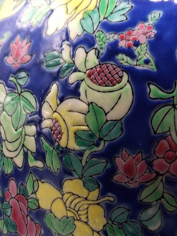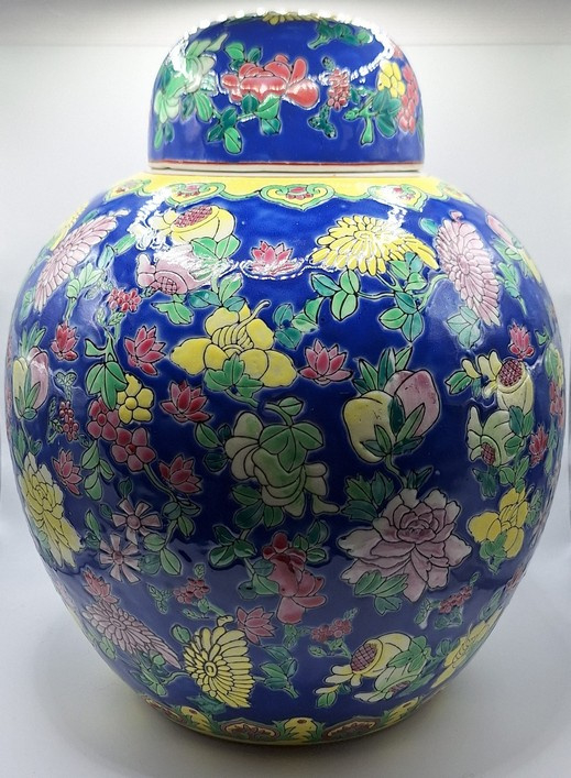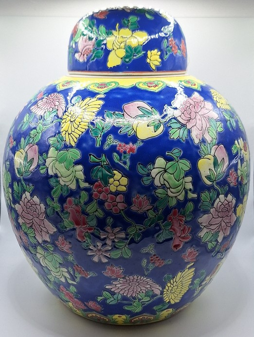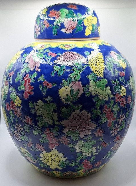 Artikelnummer: C26114Een Chinese keramische gemberpot, daterend uit het midden van de 20e eeuw, circa 1940. De kobaltblauwe ondergrond vormt het decor voor een kleurrijk palet van geëmailleerde bladmotieven.