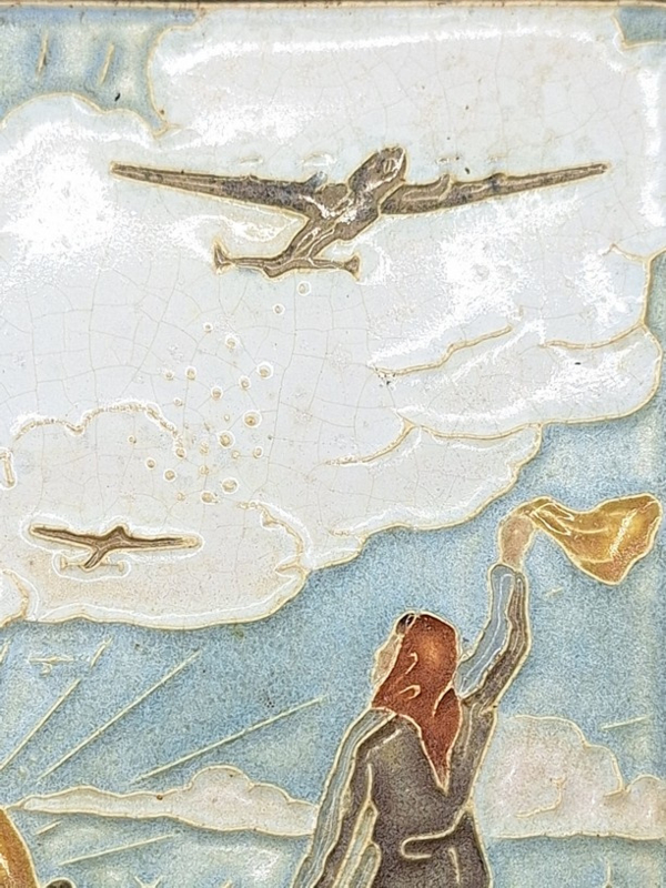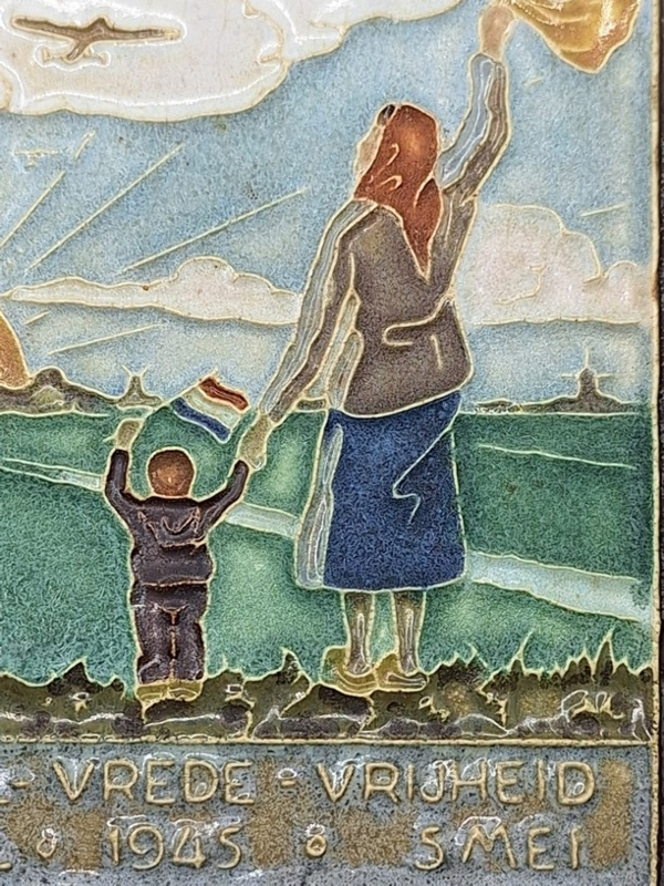 Artikelnummer: A26130Cloisonné tegel vervaardigd door plateelfabriek De Porceleyne Fles te Delft met de titel 'Voedsel - Vrede - Vrijheid 29 april 1945 - 5 mei'. De tegel geeft een beeld weer van een Hollandse vrouw met haar kind, die wuift naar de geallieerden. Aan de achterkant is een draadje aanwezig waarmee het tegeltje opgehangen kan worden.