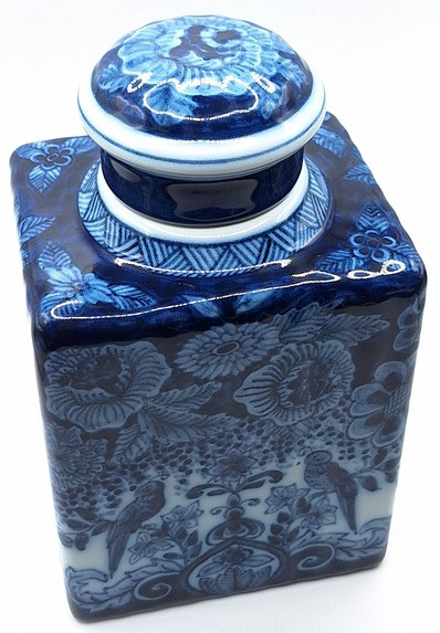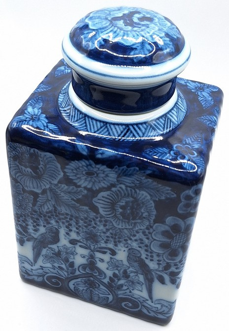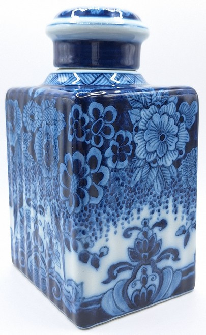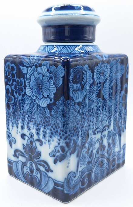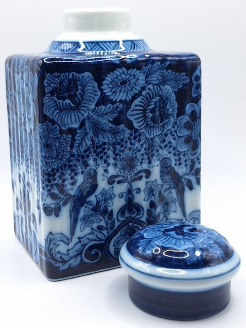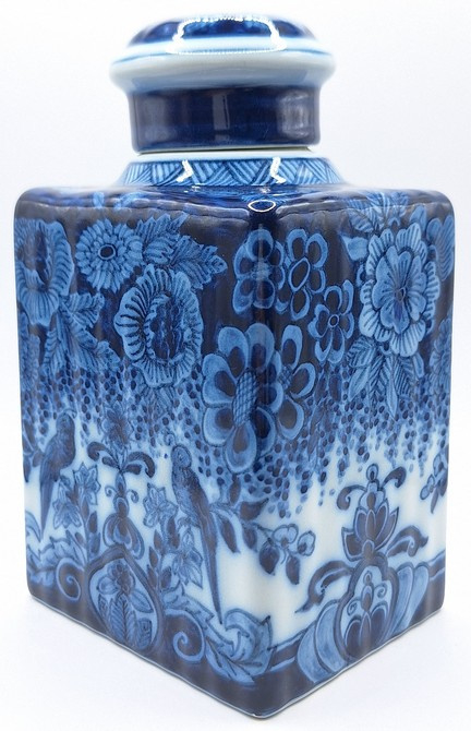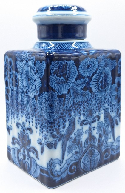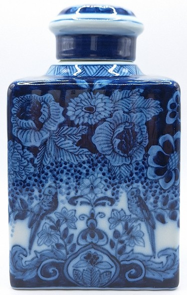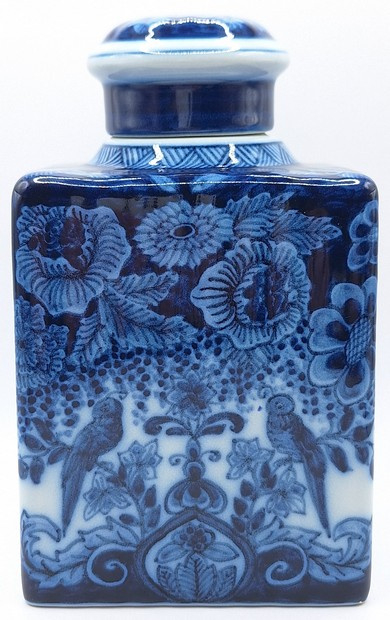 Artikelnummer: A26133Een zeer fraai gedecoreerde theebus, gemaakt door de Tichelaar fabriek. De stop fungeert tevens als maatbekertje voor de thee. Het flesje heeft een rijke, gedetaillerde, handgeschilderde, florale decoratie met vogels.