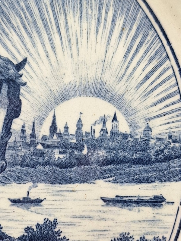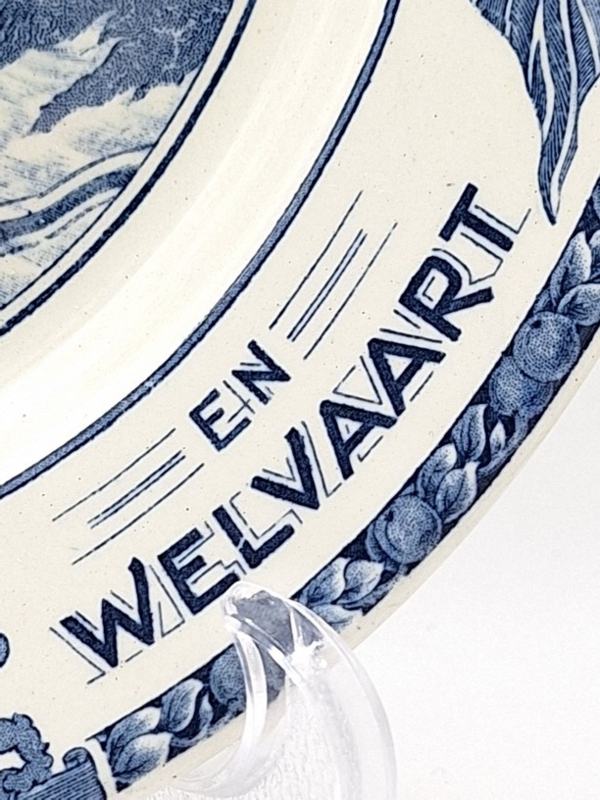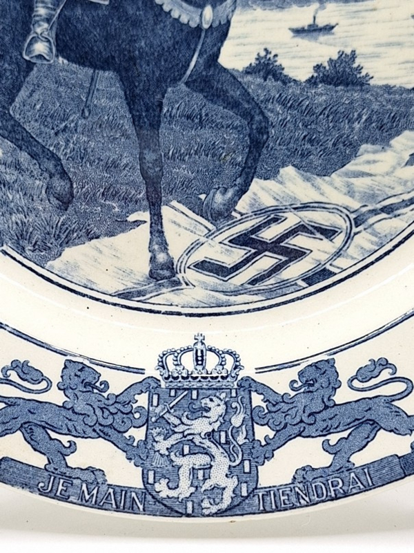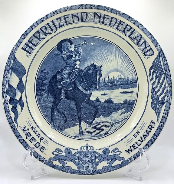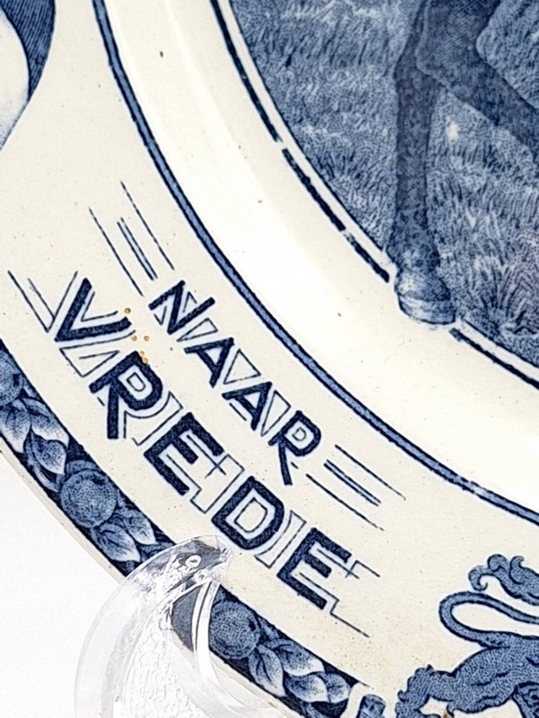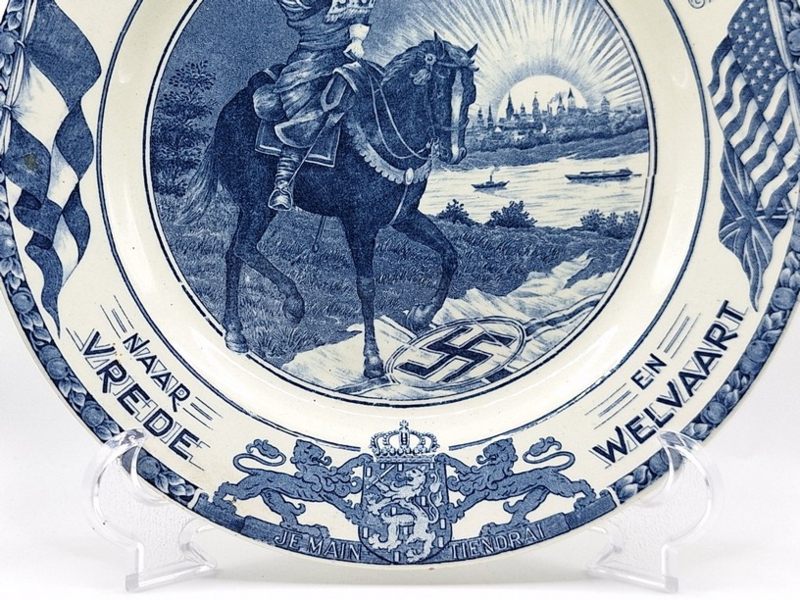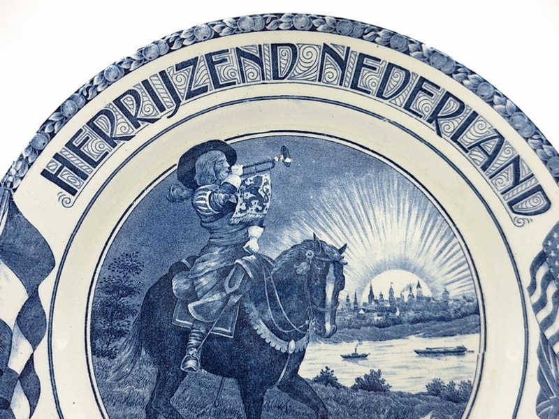 Artikelnummer: A26139Prachtig wandbord gemaakt door Société Céramique in 1945. Op het bord staat de tekst 'Herrijzend Nederland naar vrede en welvaart' en geeft de voorsteling weer van een ruiter te paard welke een vergescheurde nazi-vlag vertrapt. Het bord is gemaakt ter herinnering van het einde van de Tweede Wereldoorlog en de bevrijding van Nederland.