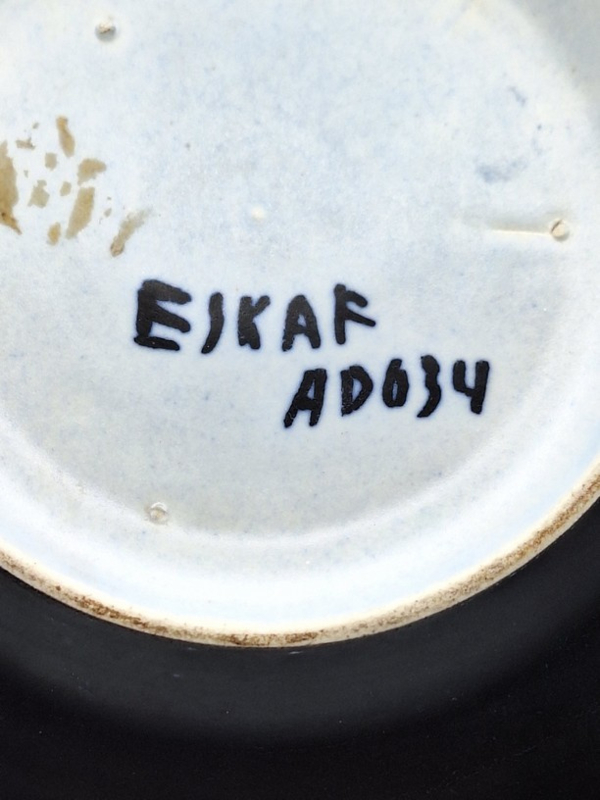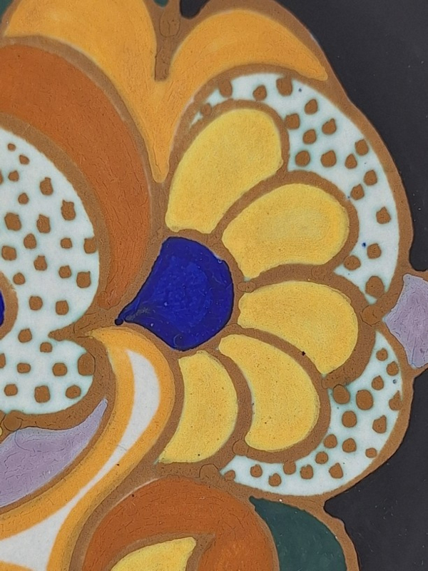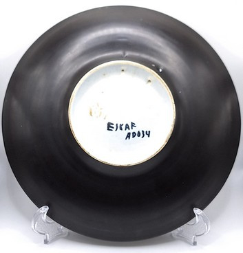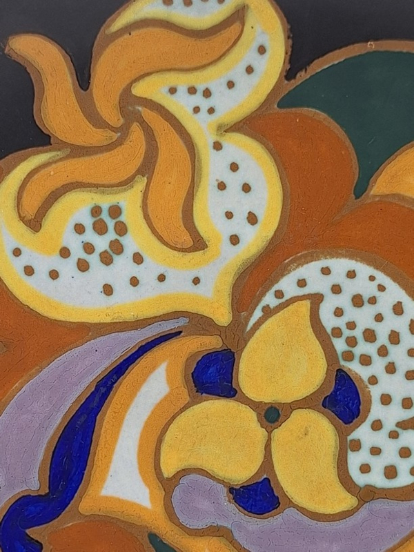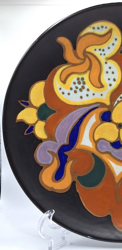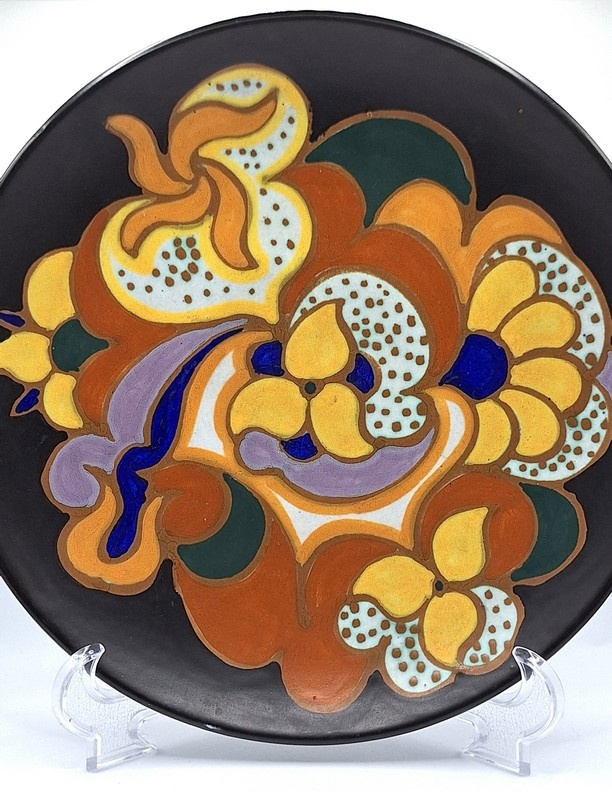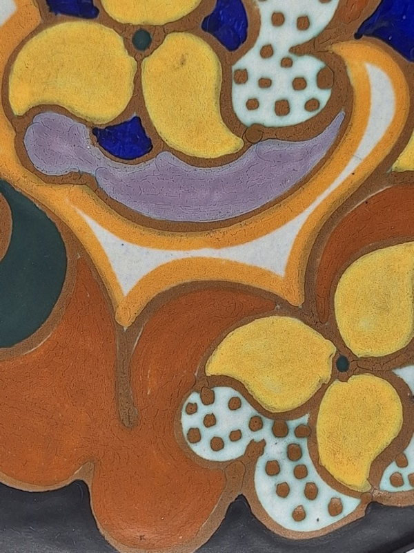 Artikelnummer: A26141Prachtige antieke plateel schaal, gemerkt met Eskaf (Eerste steenwijker Kunst aardewerk Fabriek) ADO34. Aan de achterkant van de schaal zijn gaatjes aanwezig. Hierdoor kan een touwtje gehaald worden, zodat het opgehangen kan worden. Het heeft de typische hippie, flower power uitstraling.