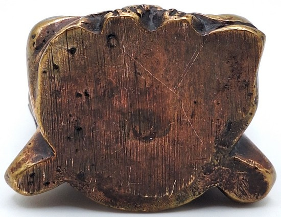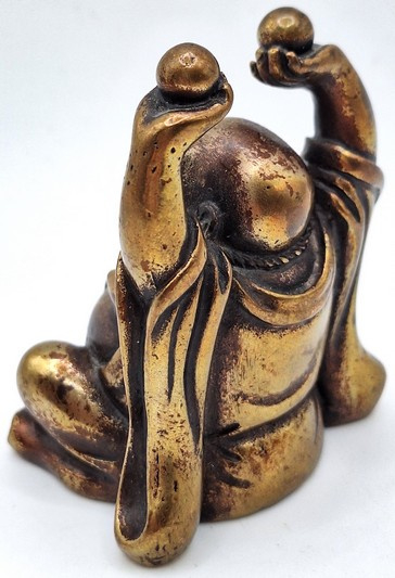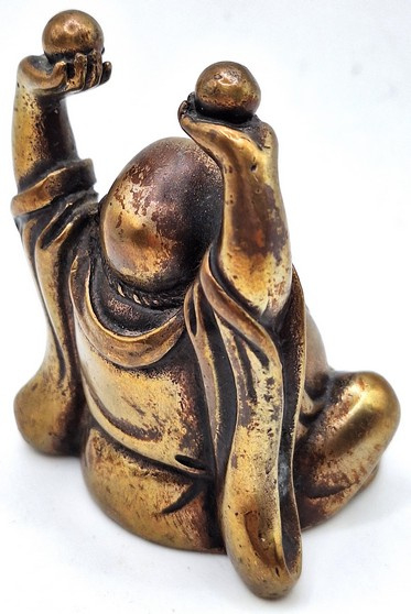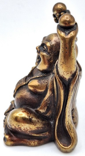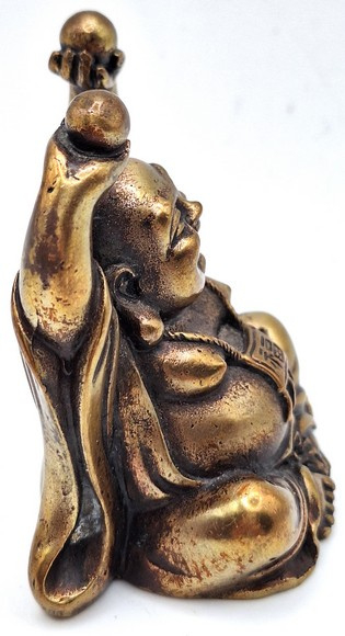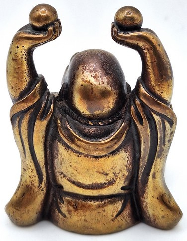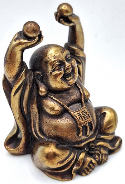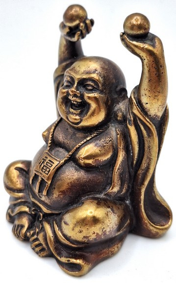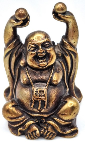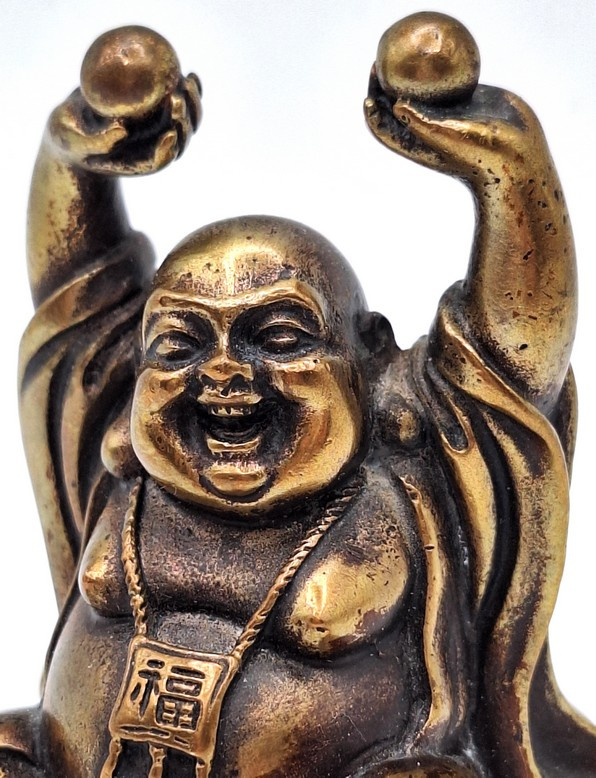 Massief messing beeldje van de lachende Boeddha, uitgevoerd in een donkere koperen tint. Het figuur is afgebeeld in een vrolijke houding met beide armen omhoog, waarbij hij ronde bollen vasthoudt wat staat voor geluk en welvaart.