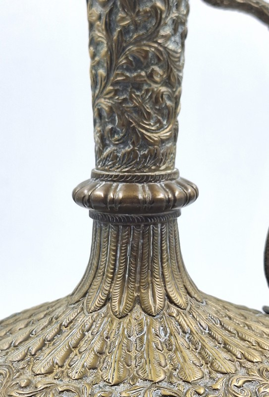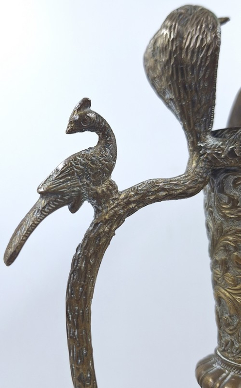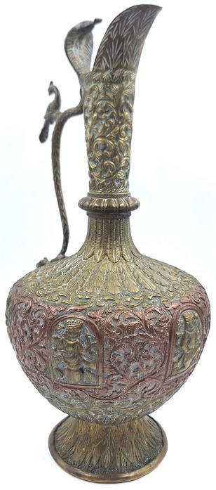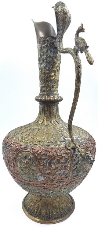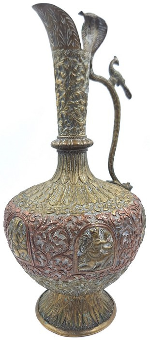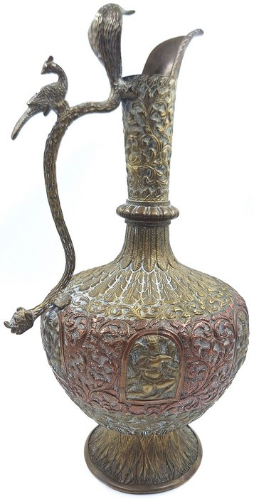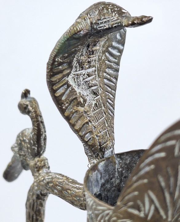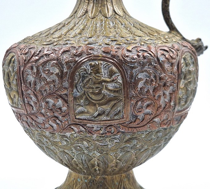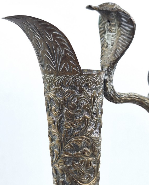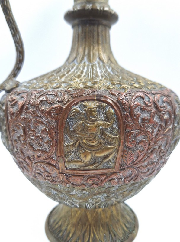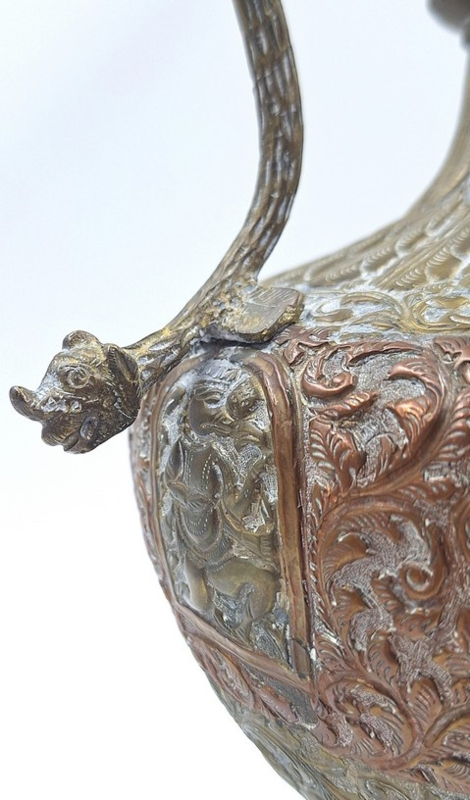 Het handvat van de kan is fraai vormgegeven met een cobra-slang en een vogel, wat het een decoratief karakter geeft. De buik is voorzien van reliëfdecoraties van godheden en typische florale motieven.