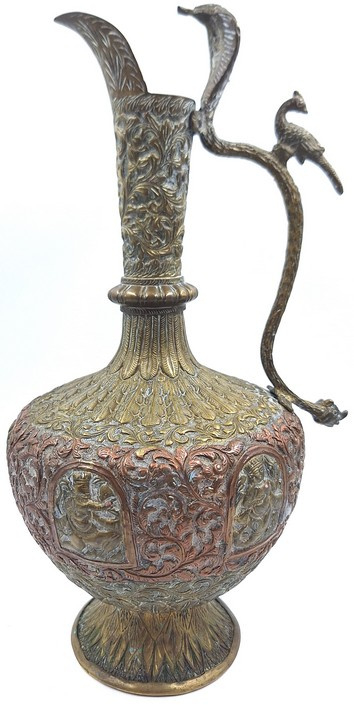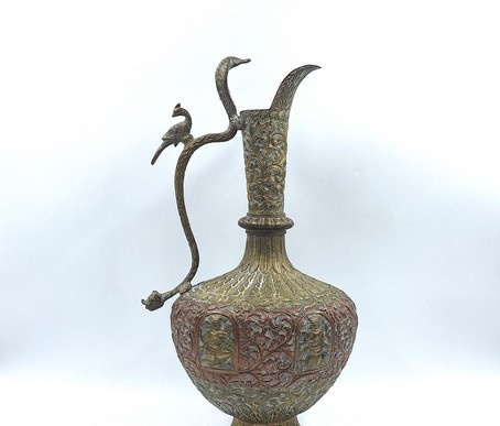 Artikelnummer: B26103Rijk gedecoreerde schenkkan van (rood-) koper, afkomstig uit India. De schenkkan werd oorspronkelijk gebruikt voor het serveren van water of olie.