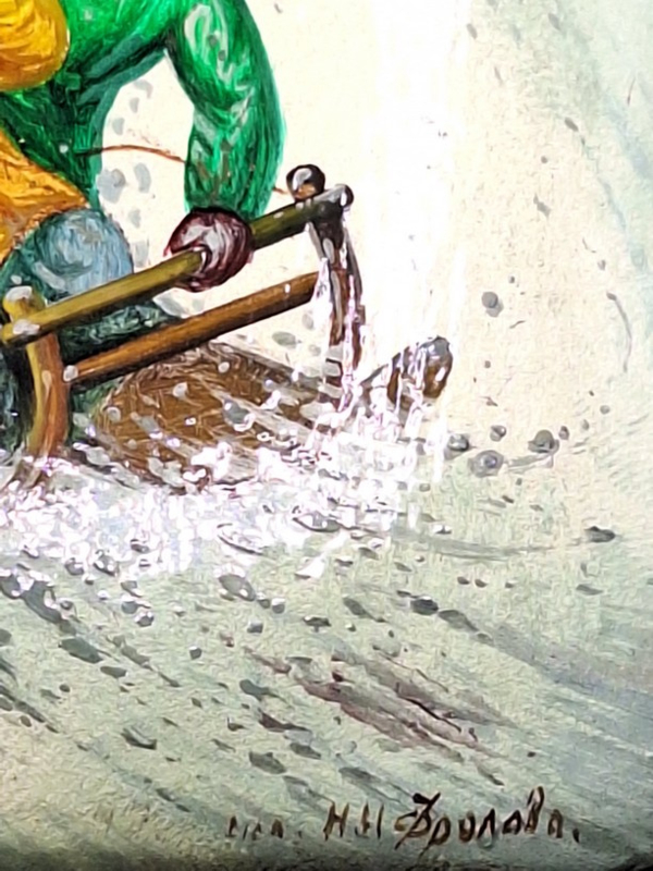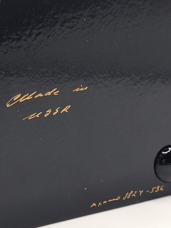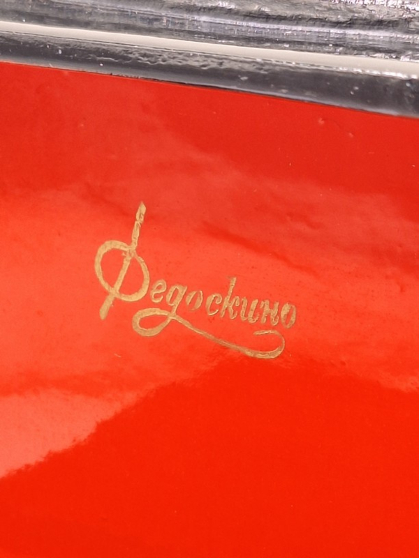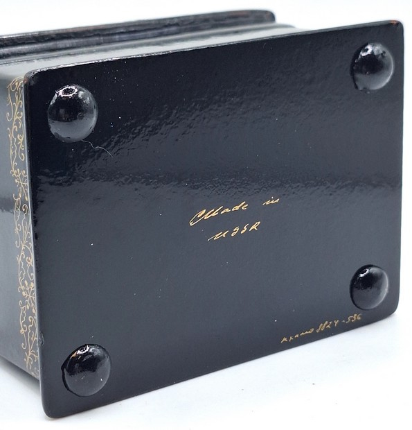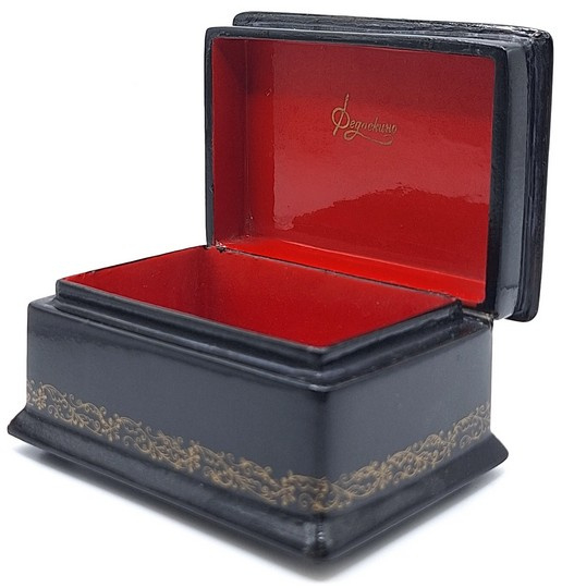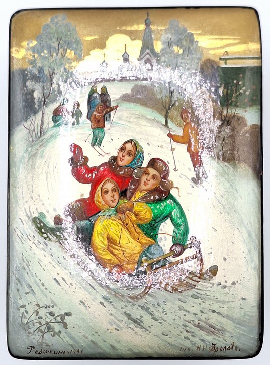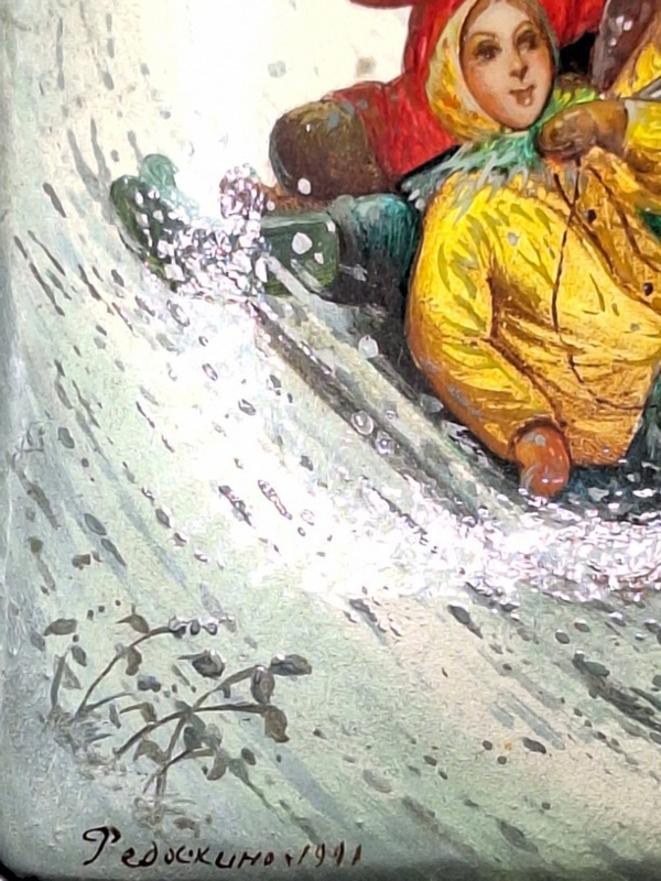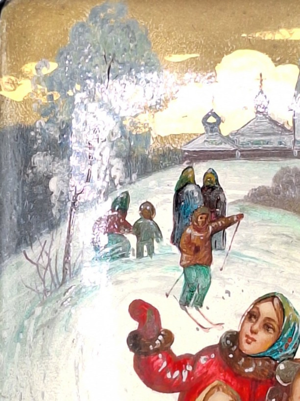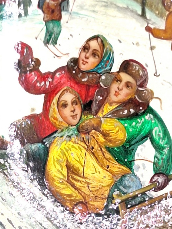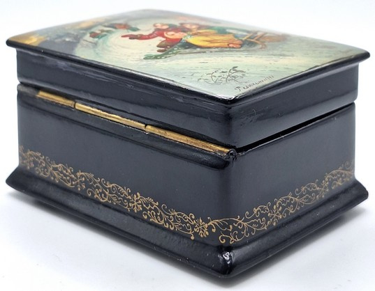 Artikelnummer: O26102Russisch zwart gelakt doosje, met een miniatuurschildering op de deksel. De schildering is een voorstelling van speelse activiteiten in de sneeuw, waaronder 3 sleeënde kinderen. Met name de gezichtjes zijn fenomenaal vormgegeven. Ook de geaccentueerde details met goudkleurige verf zijn prachtig. De binnenkant is rood gelakt.