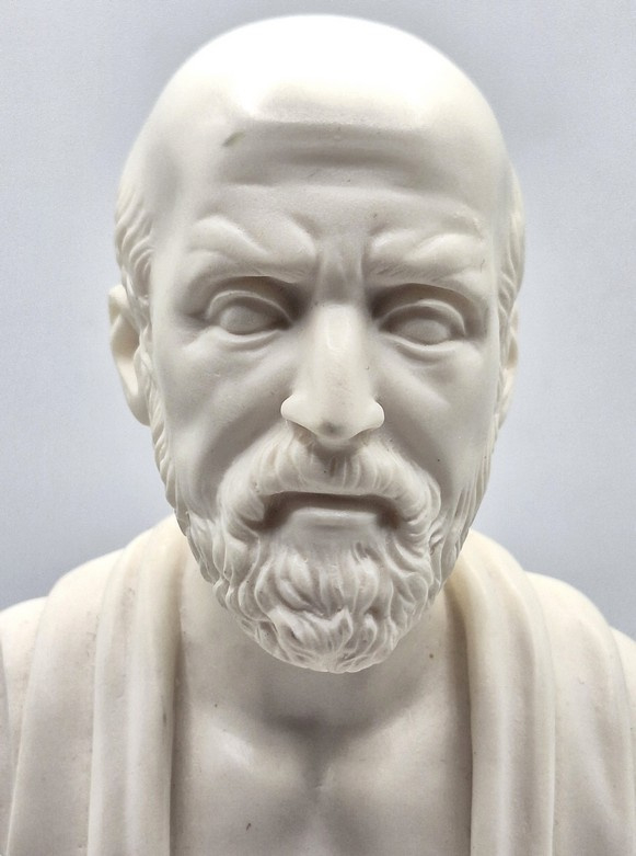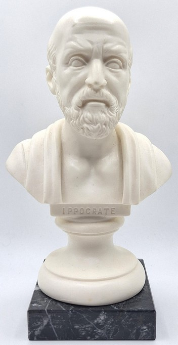 Artikelnummer: O26104Prachtige gedetailleerde buste van Hippocrates op zwarte, stenen basement. Op de voorkant staat "Ippocrate".