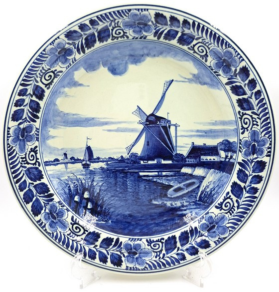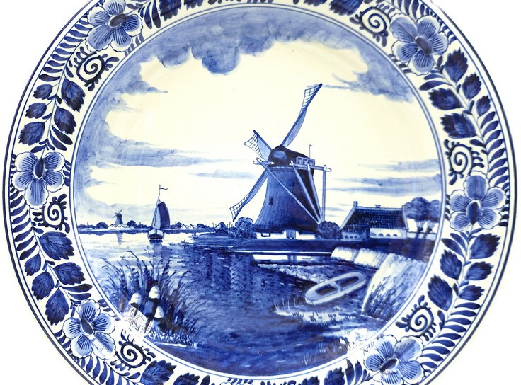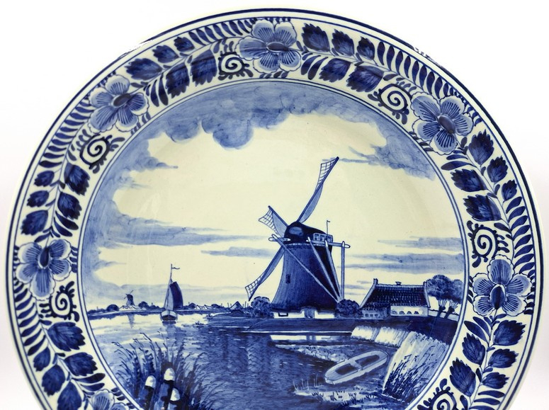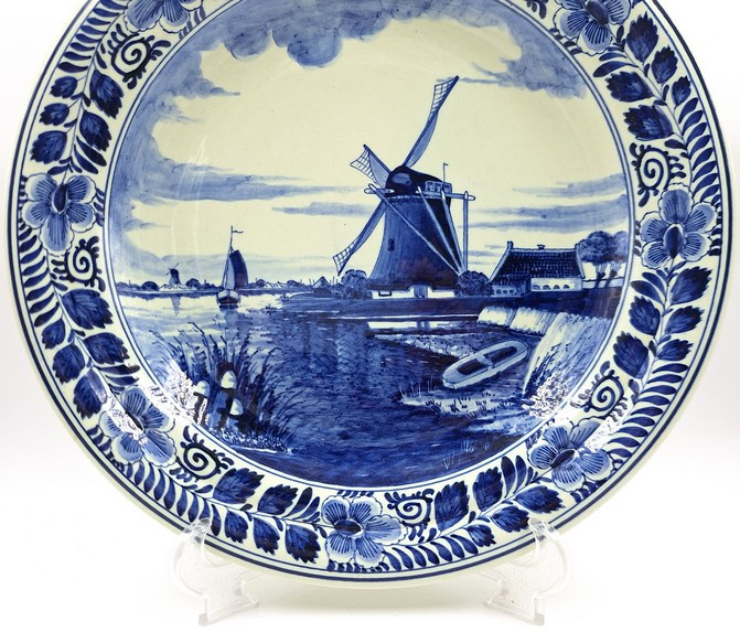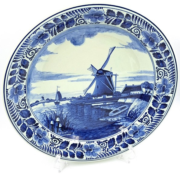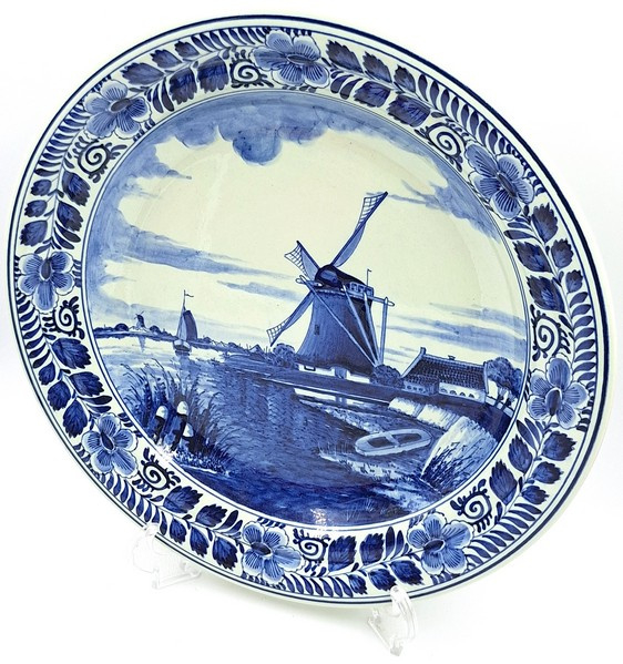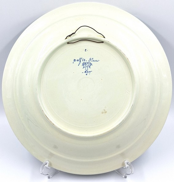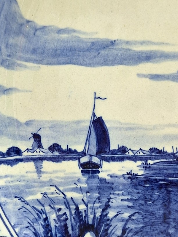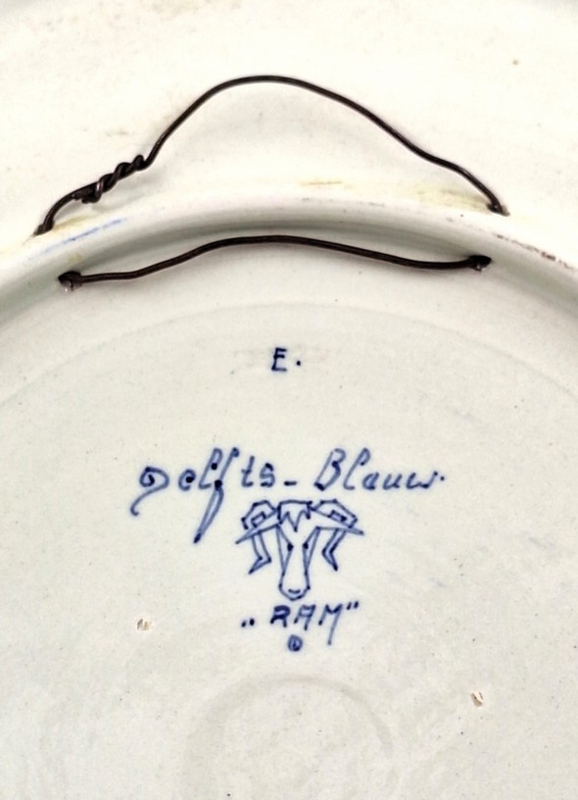 Artikelnummer: A26152Delftsblauw RAM wandbord van de plateelbakkerij in Arnhem. Het bord is gedecoreerd met een een typische Hollandse decoratie van een boerderijen, molens en schepen.