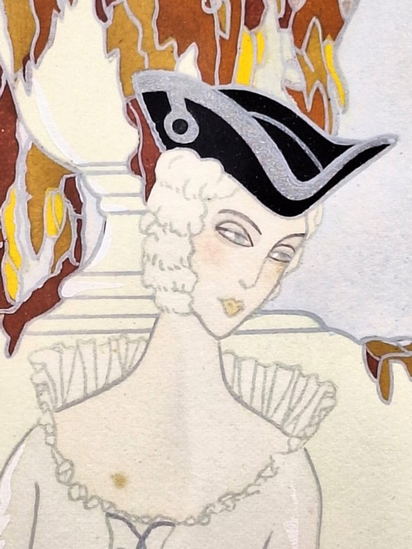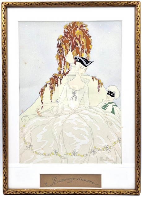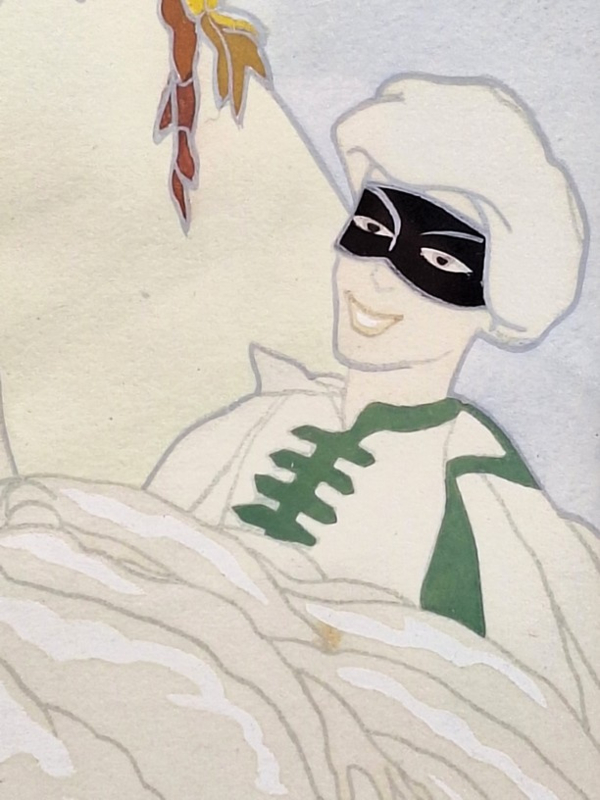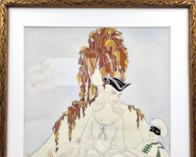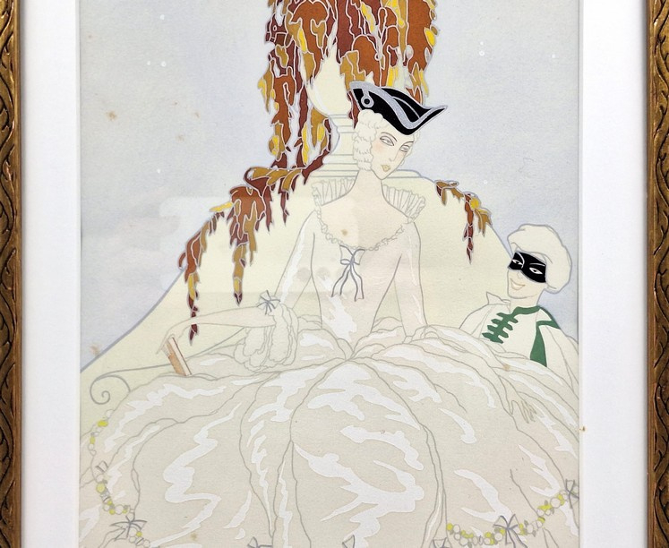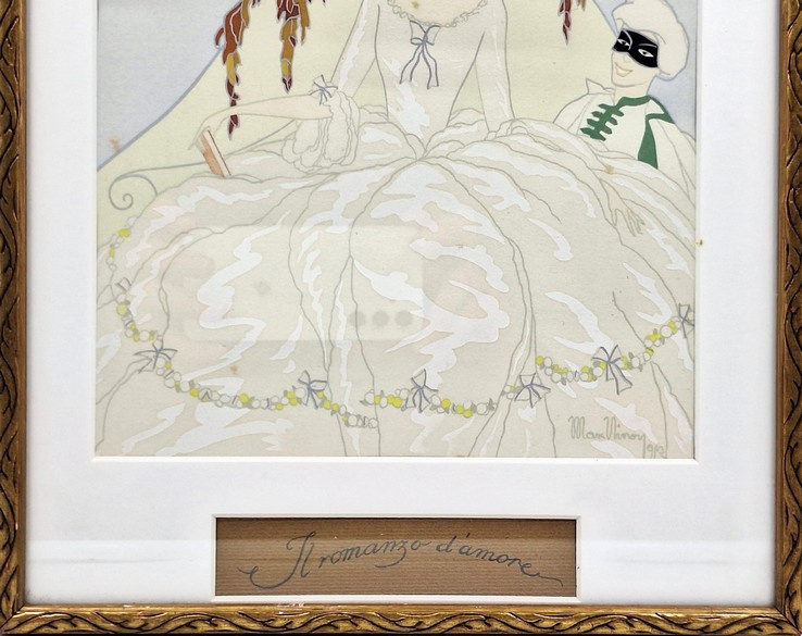 Artikelnummer: S26104Sfeervolle pochoir van Max Nimoy, rechtsonder gesigneerd. De voorstelling toont een elegante dame in een sierlijke jurk, vergezeld door een gemaskerde figuur, uitgevoerd in een verfijnde en dromerige stijl die doet denken aan de vroege 20e eeuw.
