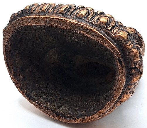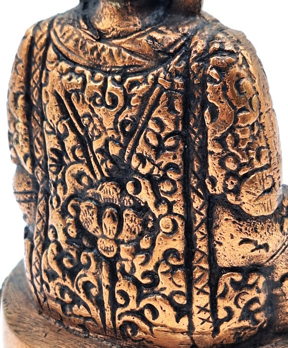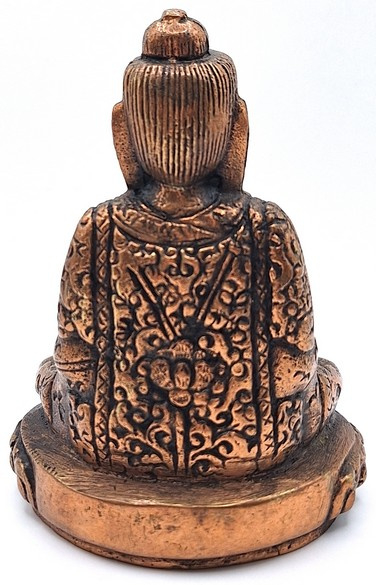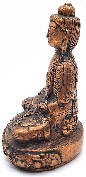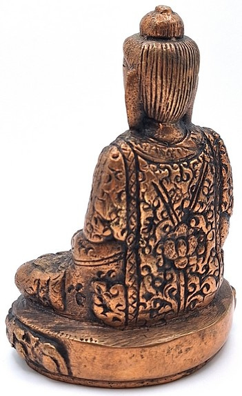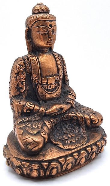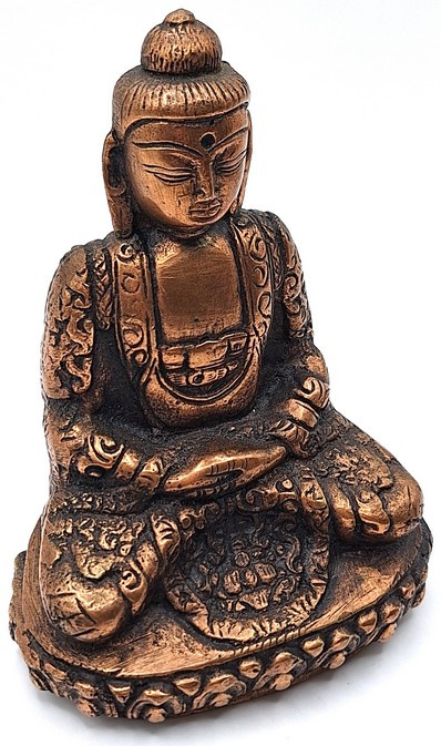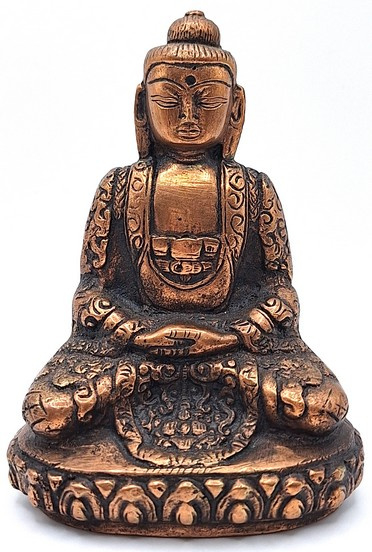 Met veel vakmanschap gemaakte messing boeddhabeeld in zittende meditatiehouding, uitgevoerd in een warme koperkleurige tint. Het beeld toont Boeddha met gevouwen handen in de schoot, zittend op een rijk gedecoreerde lotusbasis.