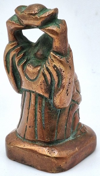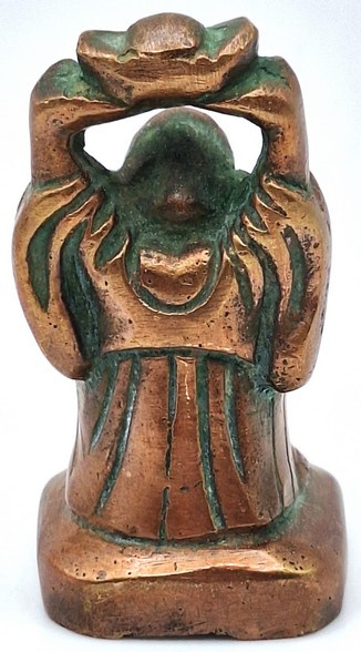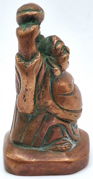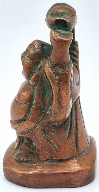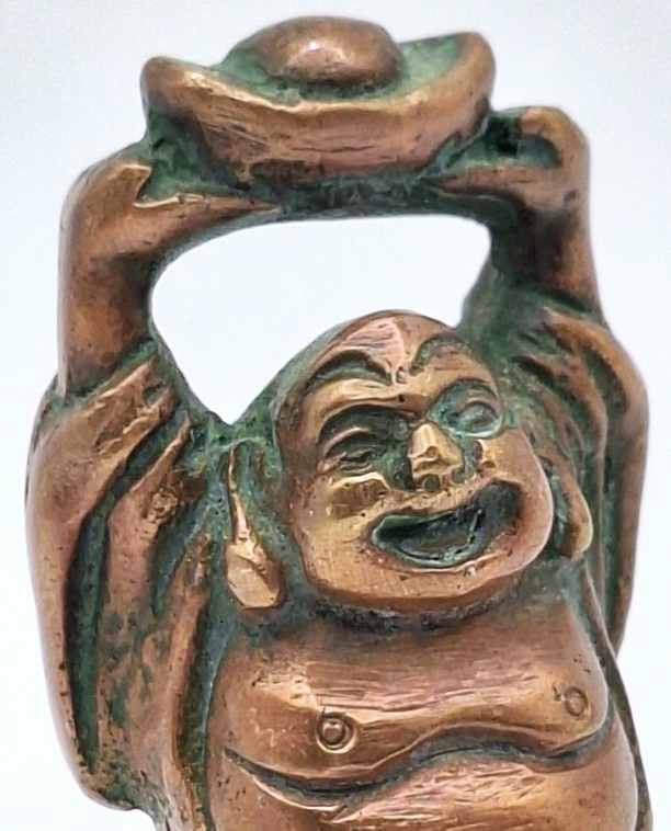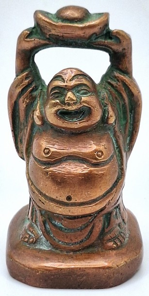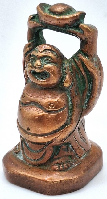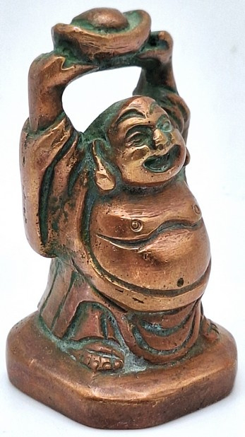 Artikelnummer: C26124Messing beeldje van de lachende Boeddha, uitgevoerd in een warme koperkleurige tint. Het figuur staat afgebeeld met opgeheven armen en houdt boven zijn hoofd een traditionele goudbaar (sycee), een symbool dat in de Chinese cultuur staat voor rijkdom en voorspoed.