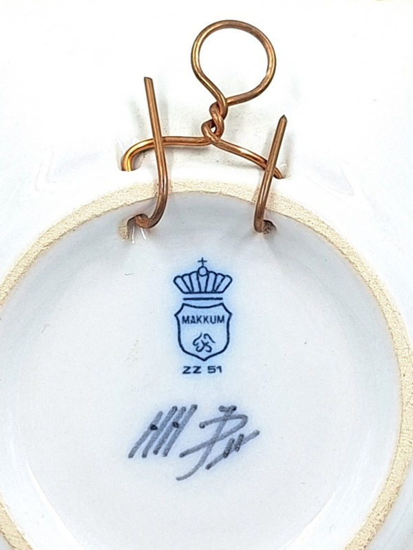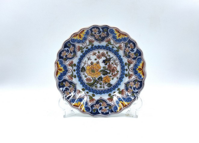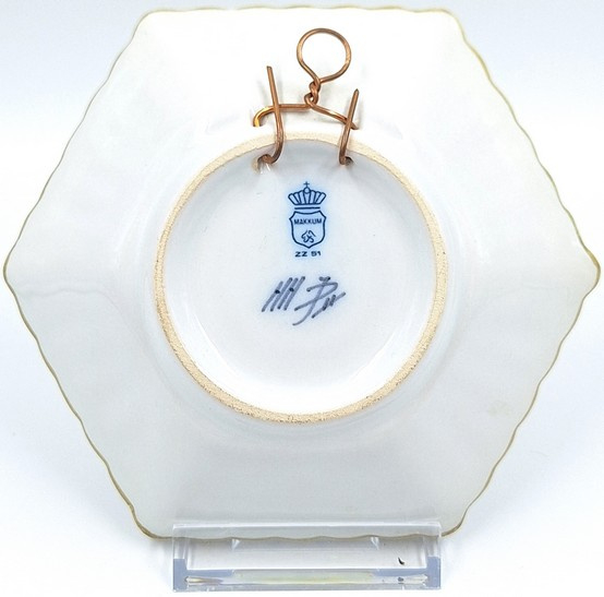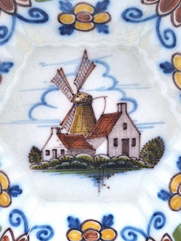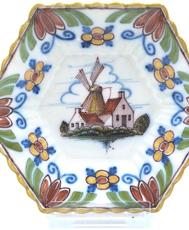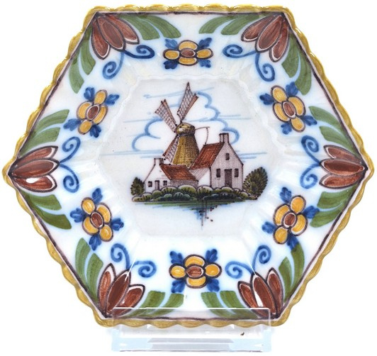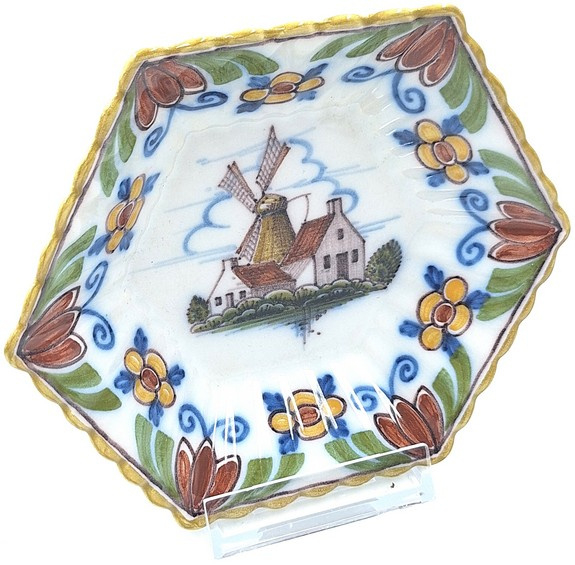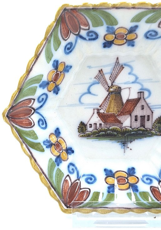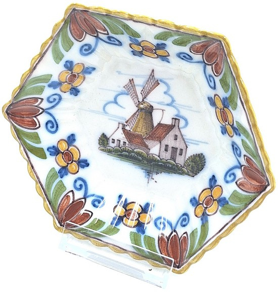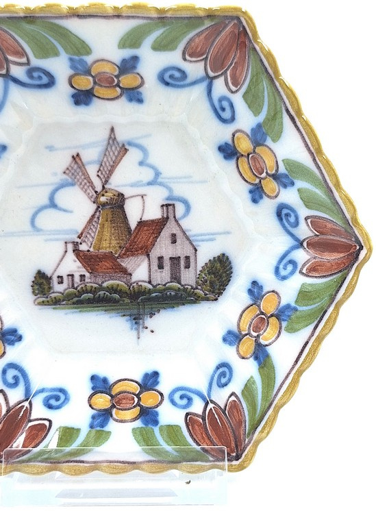 Artikelnummer: A26159Leuk klein hexagonaal bordje, vervaardigd door Makkum. De randen zijn geplooid en de polychrome decoratie stelt een boerderij met molen voor, nummer ZZ 51.