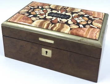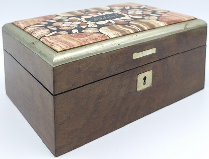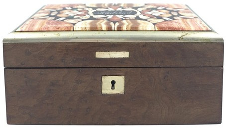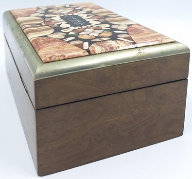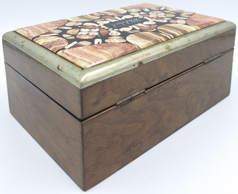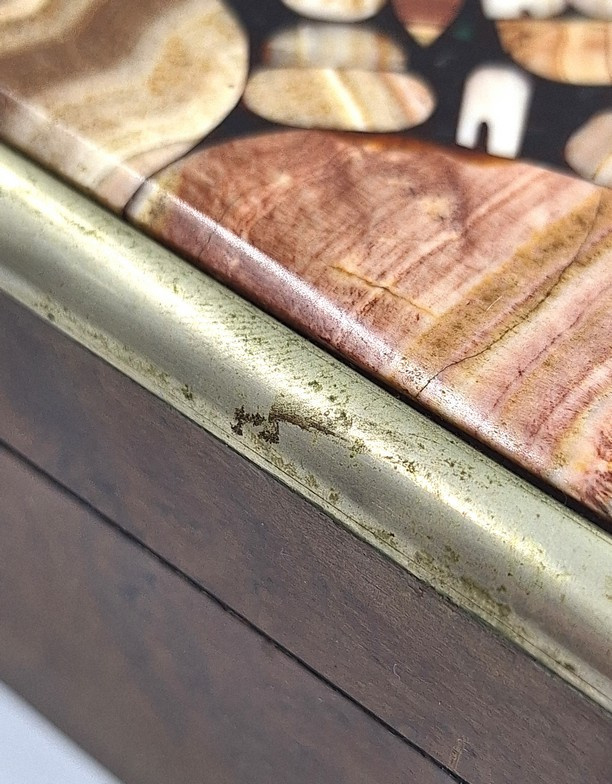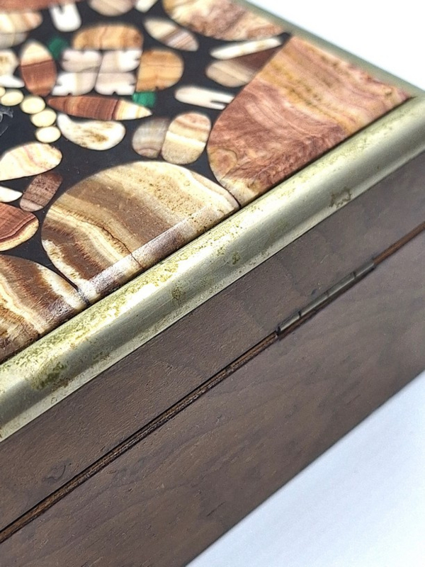 De deksel is uitgevoerd met 'pietra dura' inleg: een ambachtelijke techniek waarbij kleine stukjes gekleurde (half)edelstenen als een mozaïek zijn ingelegd.