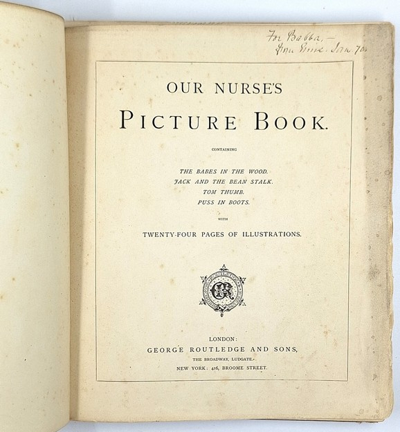 Artikelnummer: O26107Een fraai en vroeg Victoriaans prentenboek: 'Our Nurse’s Picture Book', uitgegeven door Routledge in Londen rond 1855. Dit werk bevat verschillende illustraties en is uitgevoerd in een decoratieve linnen stempelband, rijk versierd met een gouden opdruk.