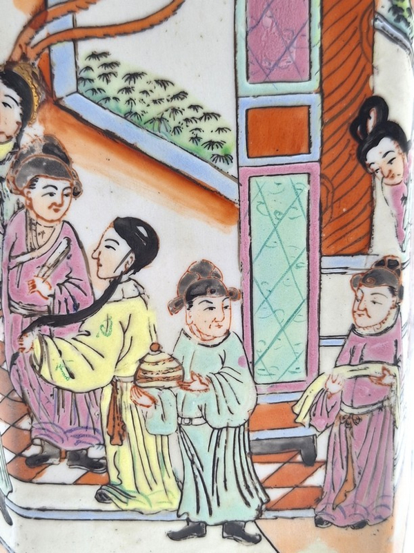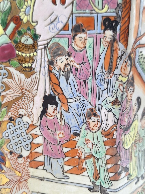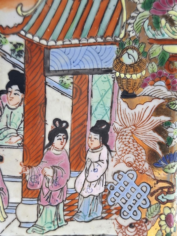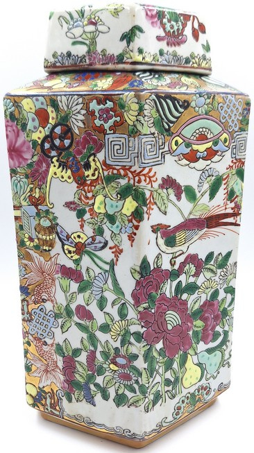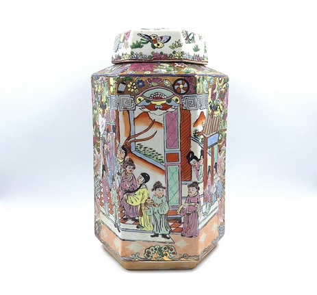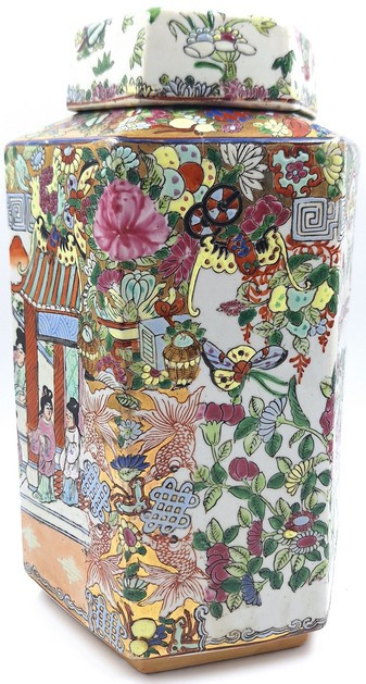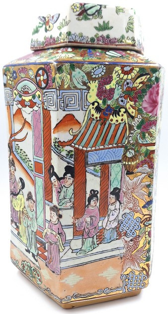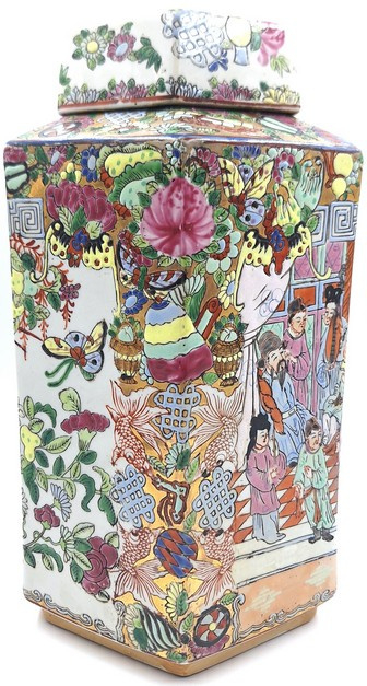 Artikelnummer: C26129Fraaie grote Chinese porseleinen dekselvaas, uitgevoerd in kleurrijke famille rose stijl. Rijkelijk gedecoreerd met gedetailleerde figuren in een traditioneel stijl.