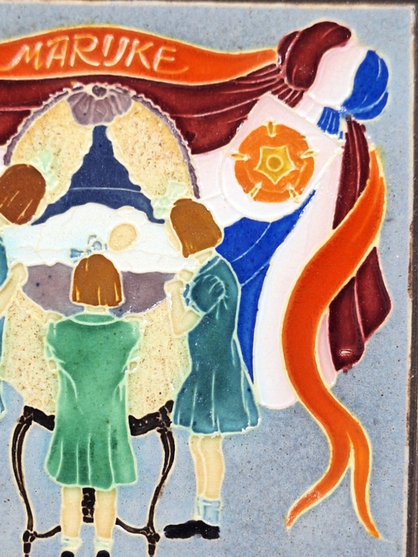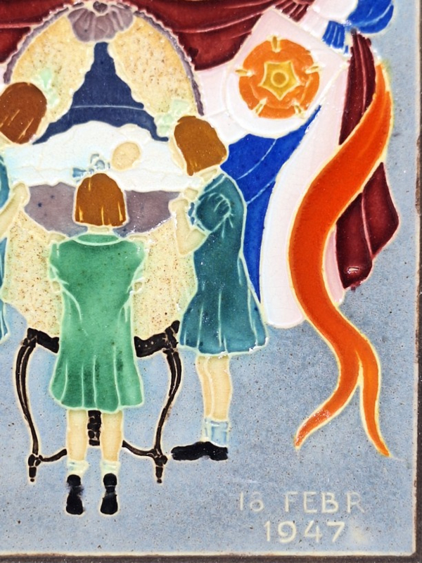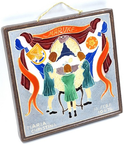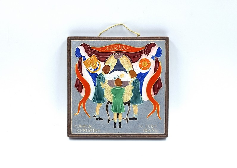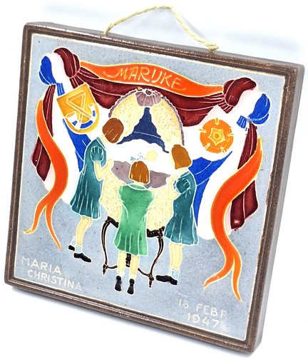 Cloisonné geboortetegeltje van Westraven, daterend uit 1947, ter gelegenheid van de geboorte van Marijke (Maria Christina) op 18 februari 1947.