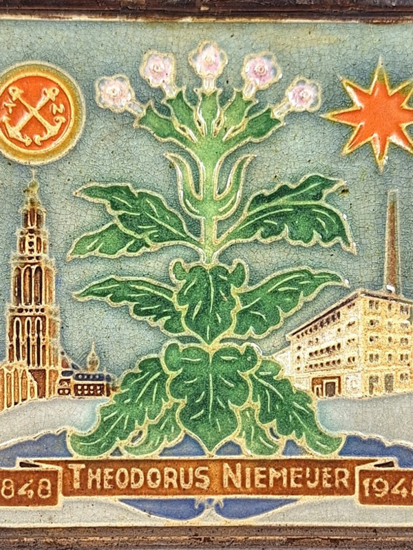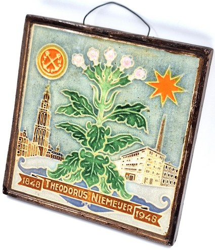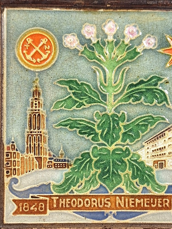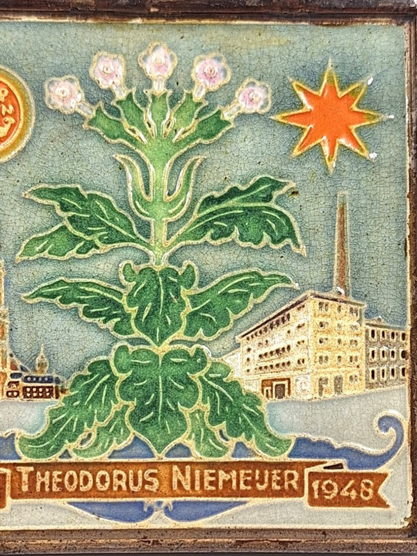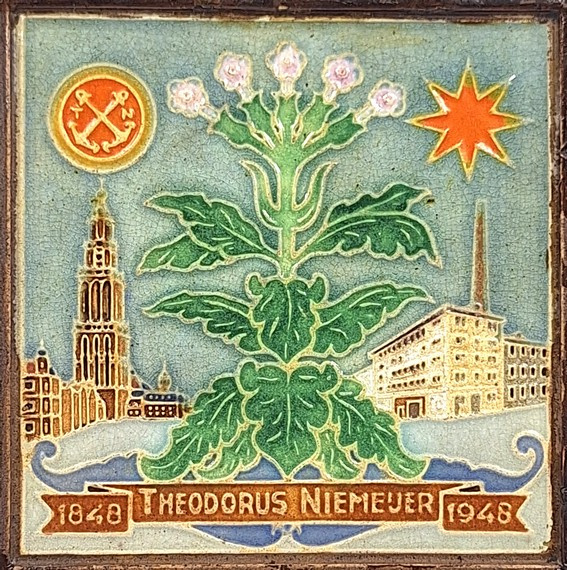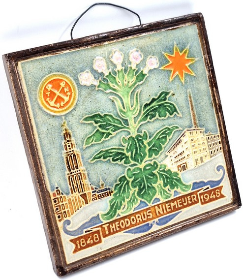 Artikelnummer: A26163Herdenkingstegel uit 1948 ter gelegenheid van het 100-jarig bestaan (1848–1948) van de tabaksfabriek Theodorus Niemeijer te Groningen. Vervaardigd door Westraven te Utrecht in cloisonné-techniek, met een decoratieve voorstelling van een tabaksplant en stadsgezichten.