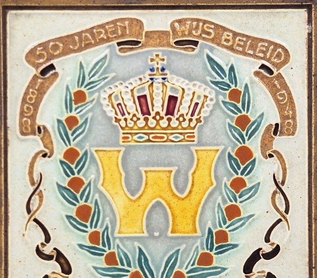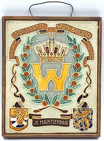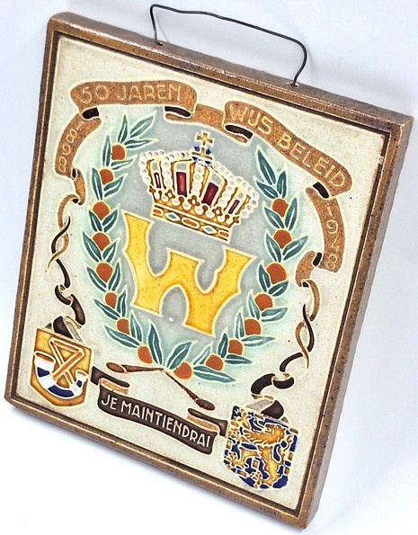 Artikelnummer: A26173Herinneringstegeltje van Westraven, uitgegeven in 1948 met de tekst '50 jaren wijs beleid 1898 - 1948', ter gelegenheid van het regeringsjubileum van koningin Wilhelmina.