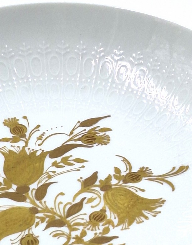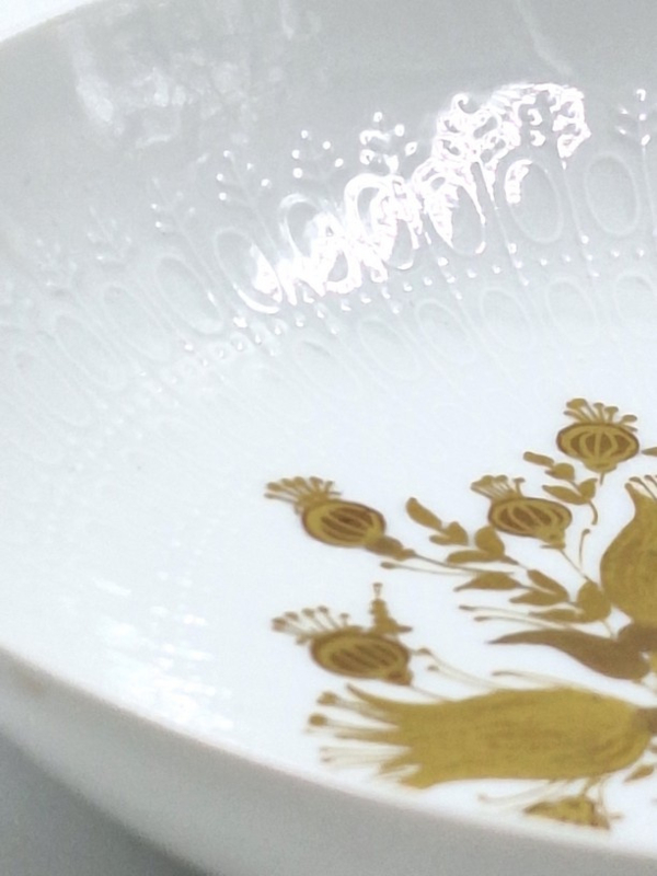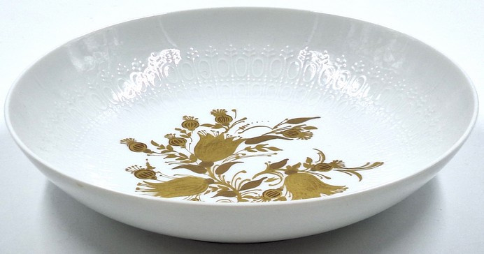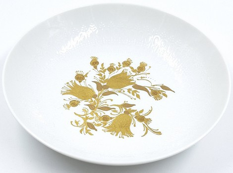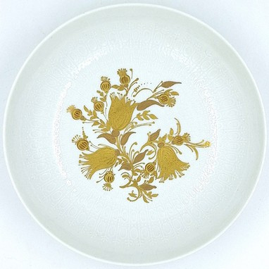 Artikelnummer: A26176Mooi vintage schaaltje met goudkleurig decor van Rosenthal Studio-Linie (Duitsland), ontworpen door Björn Wiinblad in het romantische “Romanze” decor. Een decoratief en stijlvol object uit de Studio Line collectie.