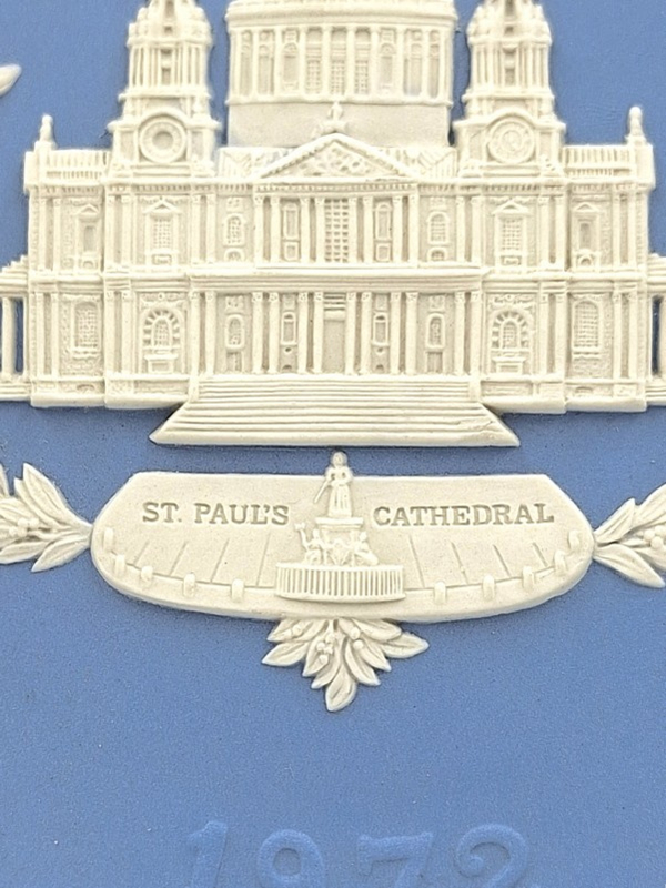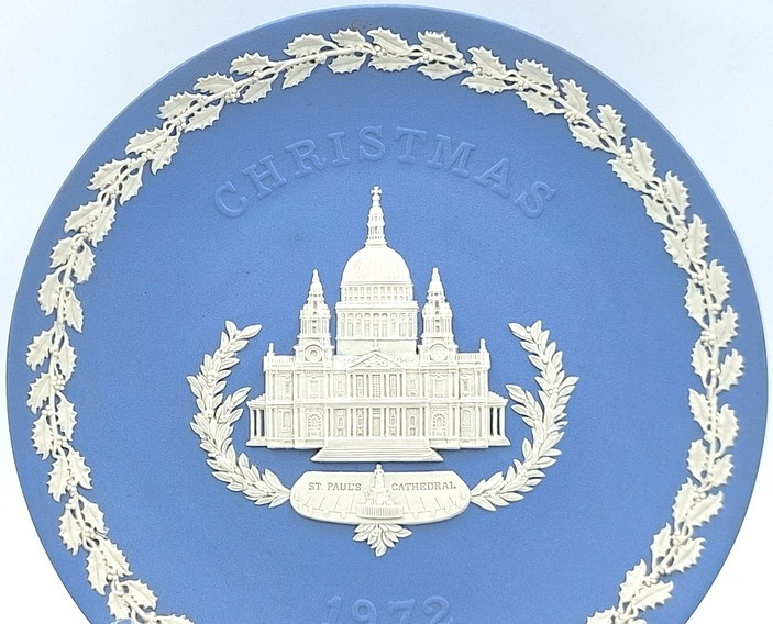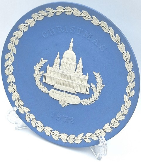 Wedgwood kerstbord uit 1972, uitgevoerd in het kenmerkende jasperware reliëf. Dit verzamelbord toont St. Paul's Cathedral en maakt deel uit van de geliefde jaarlijkse kerstuitgaven van Wedgwood. Gemerkt aan de onderzijde.