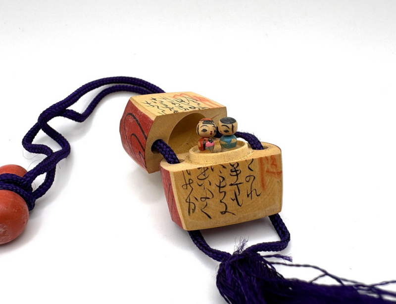 Een bijzonder klein kunstwerk - deze kleine Japanse inro met één compartiment. In de eenvoudig gedecoreerde inro bevinden zich twee micro kokeshi poppetjes. De hoofdjes van de poppetjes kunnen bewegen. Beide kanten van de inro zijn gedecoreerd met tekst.