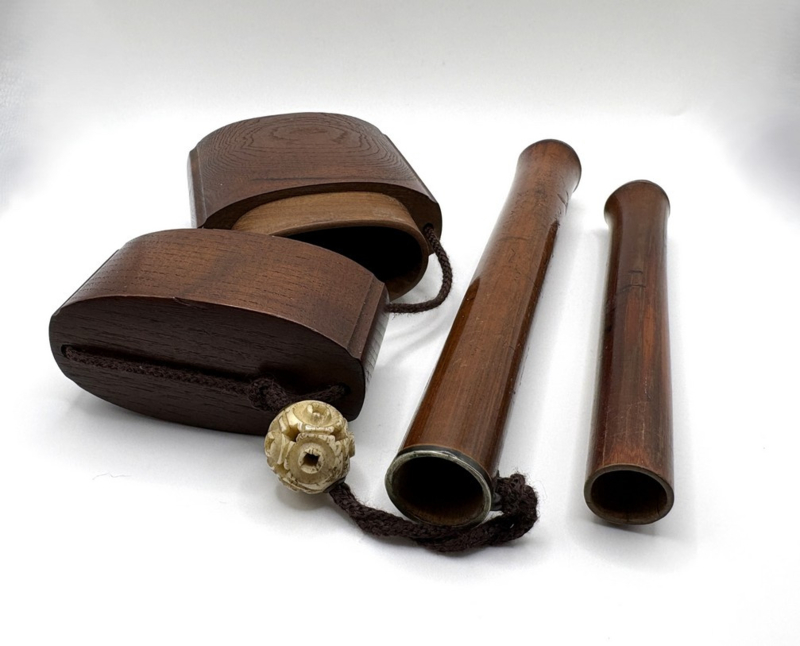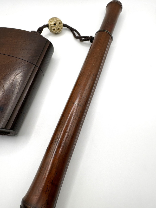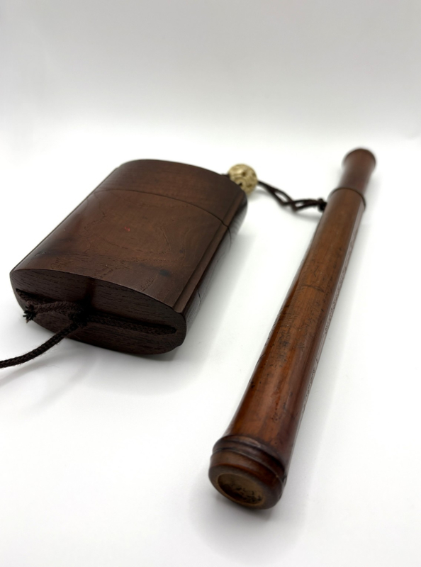 Naast de rijkelijk gedecoreerde exemplaren, is Japan ook zeer bekwaam in het vervaardigen van eenvoudige, elegante ontwerpen, die de perfecte eenheid uitstralen. Deze houten set is daar een prachtig voorbeeld van. De pijphouder is prachtig gegraveerd met Japanse tekens en een schildpad. Er zit geen kiseru bij.