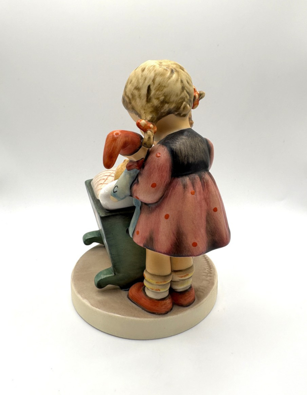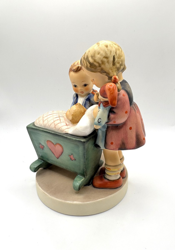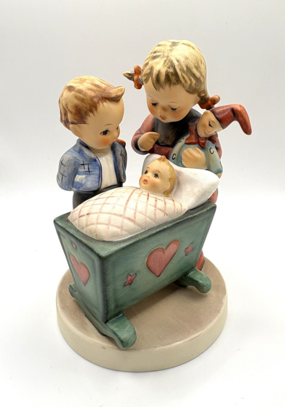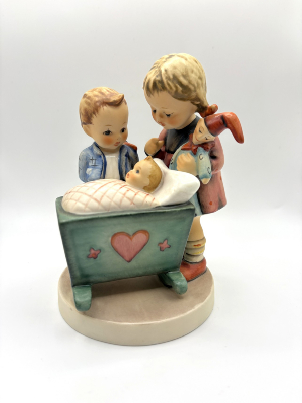 Vrolijk beeldje gemaakt door Goebel. Het Hummel beeldje is genaamd 'Das große Ereignis' / 'Blessed Event' met nummer 333. De twee kinderen bewonderen hun nieuwe broertje of zusje.