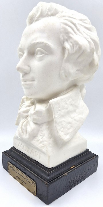 Artikelnummer: A26186Een fraaie buste van Wolfgang Amadeus Mozart, uitgevoerd met oog voor detail en klassieke elegantie. De buste is gesigneerd door Bochmann en rust op een voet met de plaquette “Wolfgang Amadeus Mozart 1756 - 1791”.