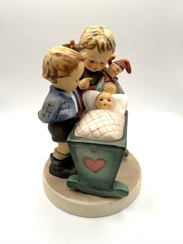 Artikelnummer: A26181Vrolijk beeldje gemaakt door Goebel. Het Hummel beeldje is genaamd 'Das große Ereignis' / 'Blessed Event' met nummer 333. De twee kinderen bewonderen hun nieuwe broertje of zusje.