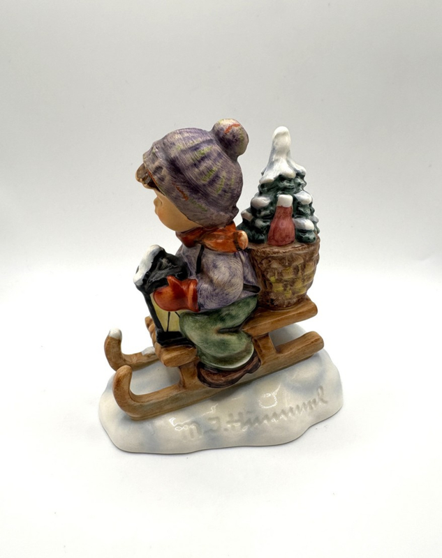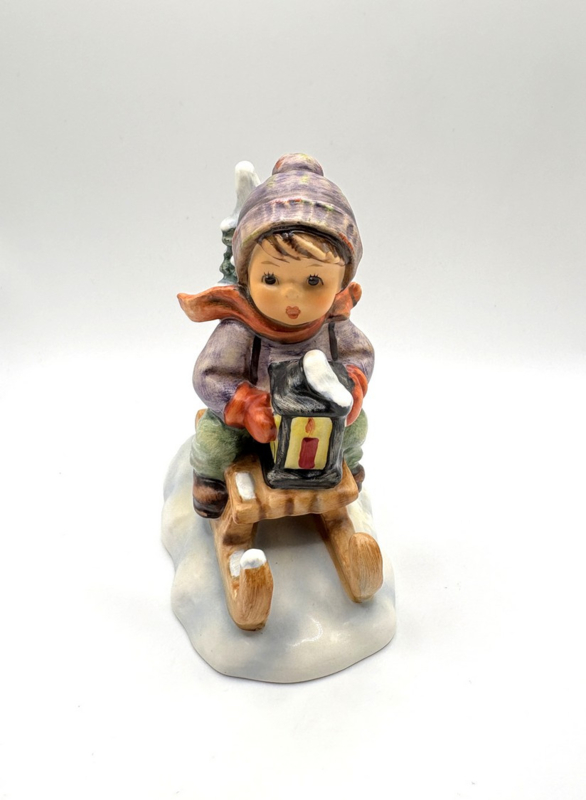 Artikelnummer: A26180Vrolijk beeldje gemaakt door Goebel. Het Hummel beeldje is genaamd 'Ride into Christmas' met nummer 396 2/0. Het jongetje is gekleed in winterkleding en glijdt met een slee van een bergje.