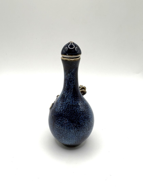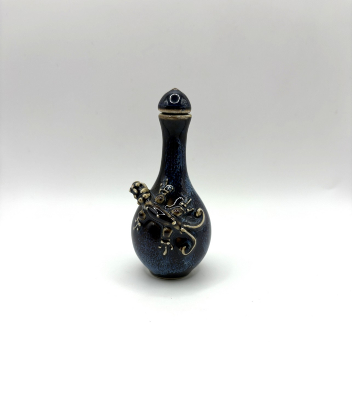 Klein Chinees snuifflesje met blauwe olievlekglazuur en kikkerdecoratie.